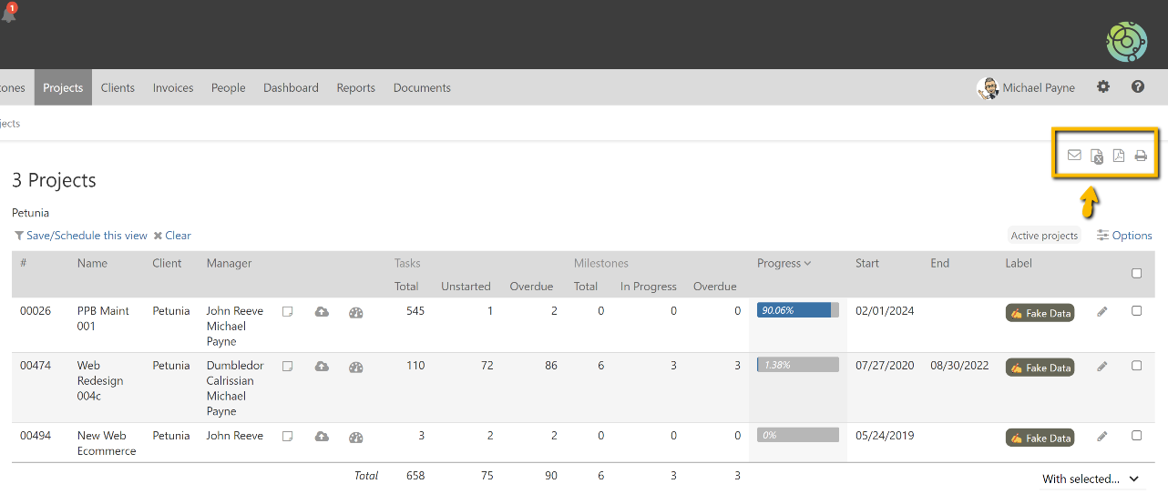 After running the filter, the listing can be exported to a spreadsheet program using the export options at the top of the project lising.