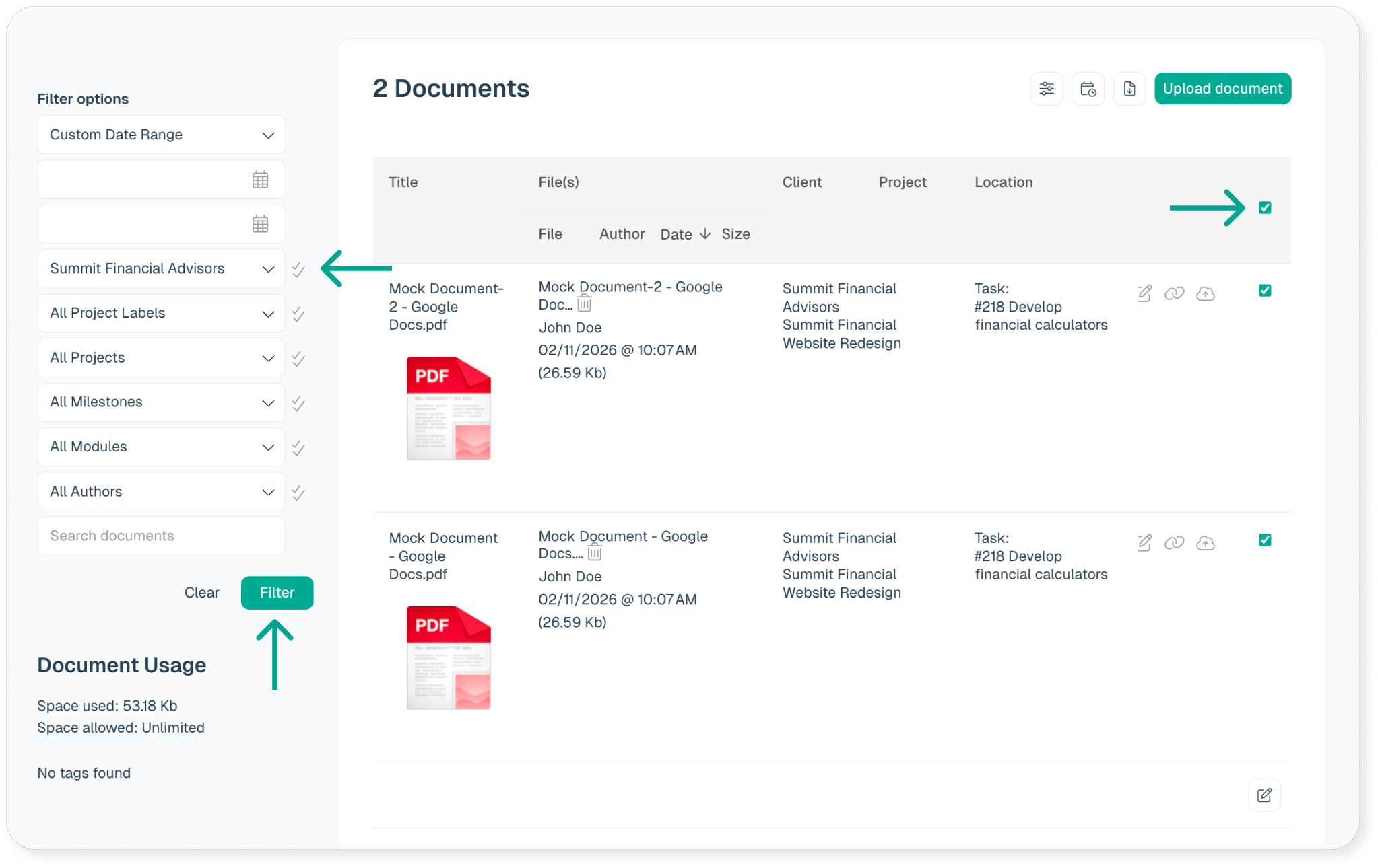 - First, running a filter on the left to show the documents that you have uploaded for a specific project, client, etc.