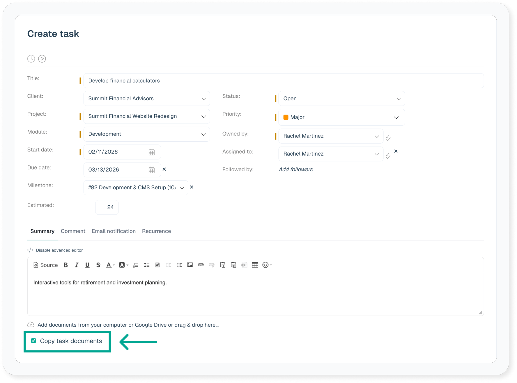 We received similar feedback from other customers and released two options that help with this. If you copy tasks a lot, but do not want to copy the documents associated with the original task there is now an option that controls this. When copying you a task you can decide whether or not to also copy the documents.
