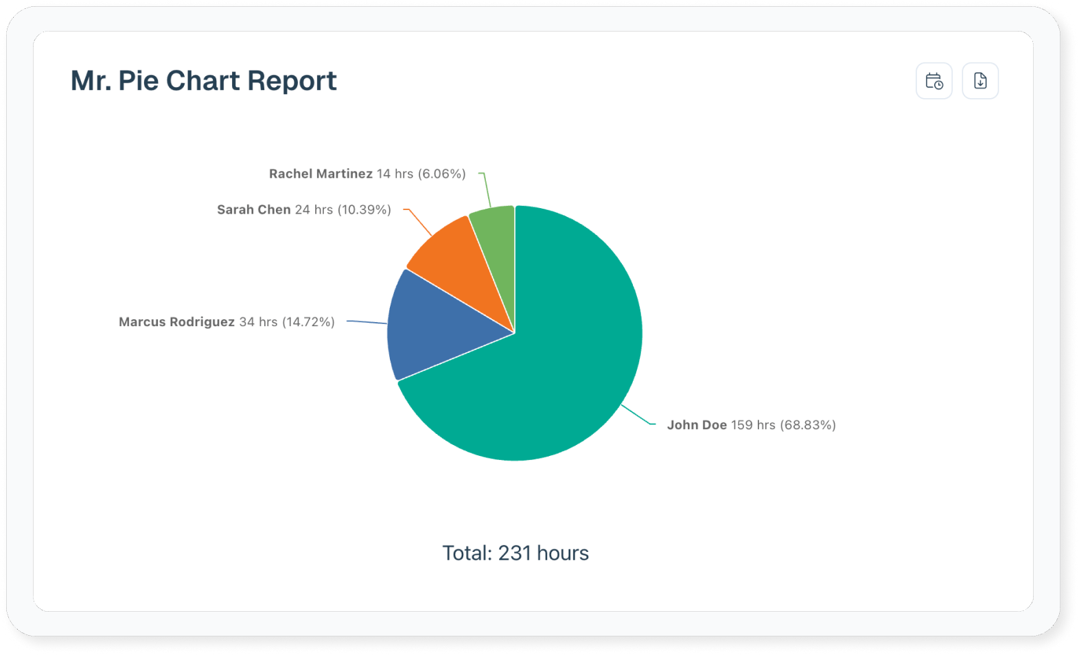 For example, you can view a Mr. Pie Chart Report by people to see who deserves a vacation, or by client to see who deserves a nice bottle of wine.