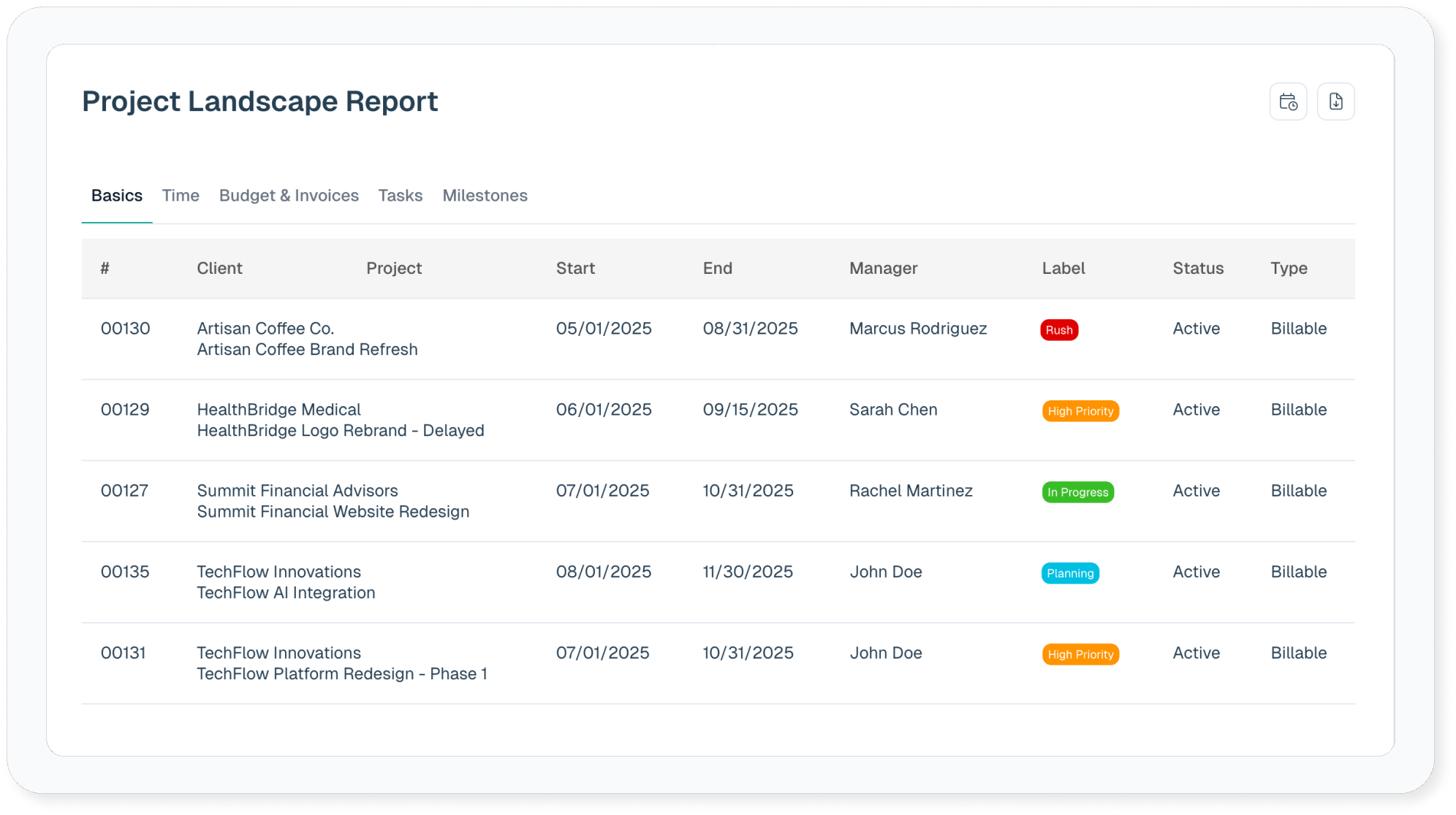 If you need to run a report to determine hi level totals for a particular client or project, the Project Landscape report generates it for you. Results are broken down into separate tabs by project estimates, task estimates, remaining hours, etc.:
