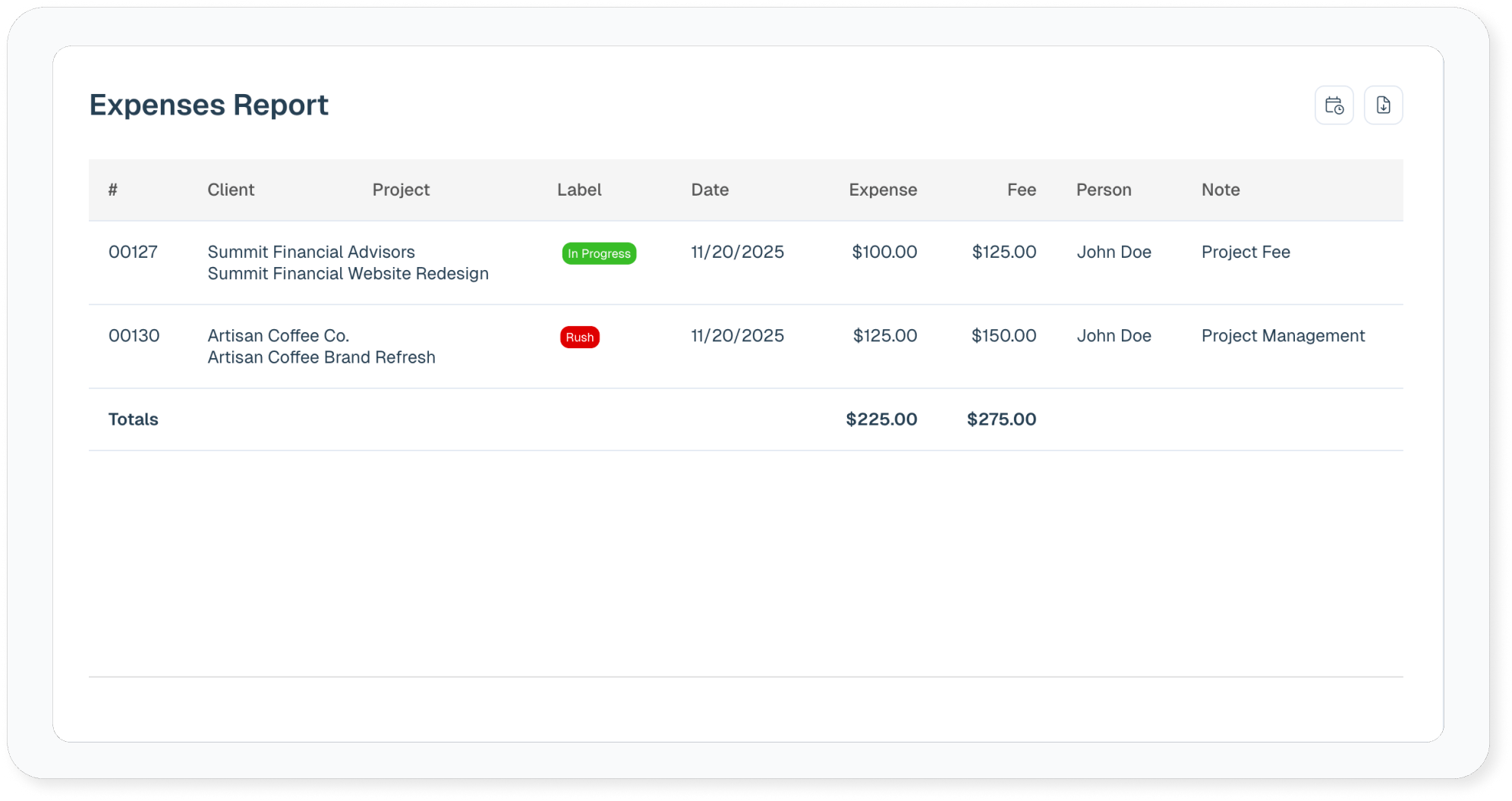 The Expenses Report is a simple report that calculates expenses across one or more clients and projects.