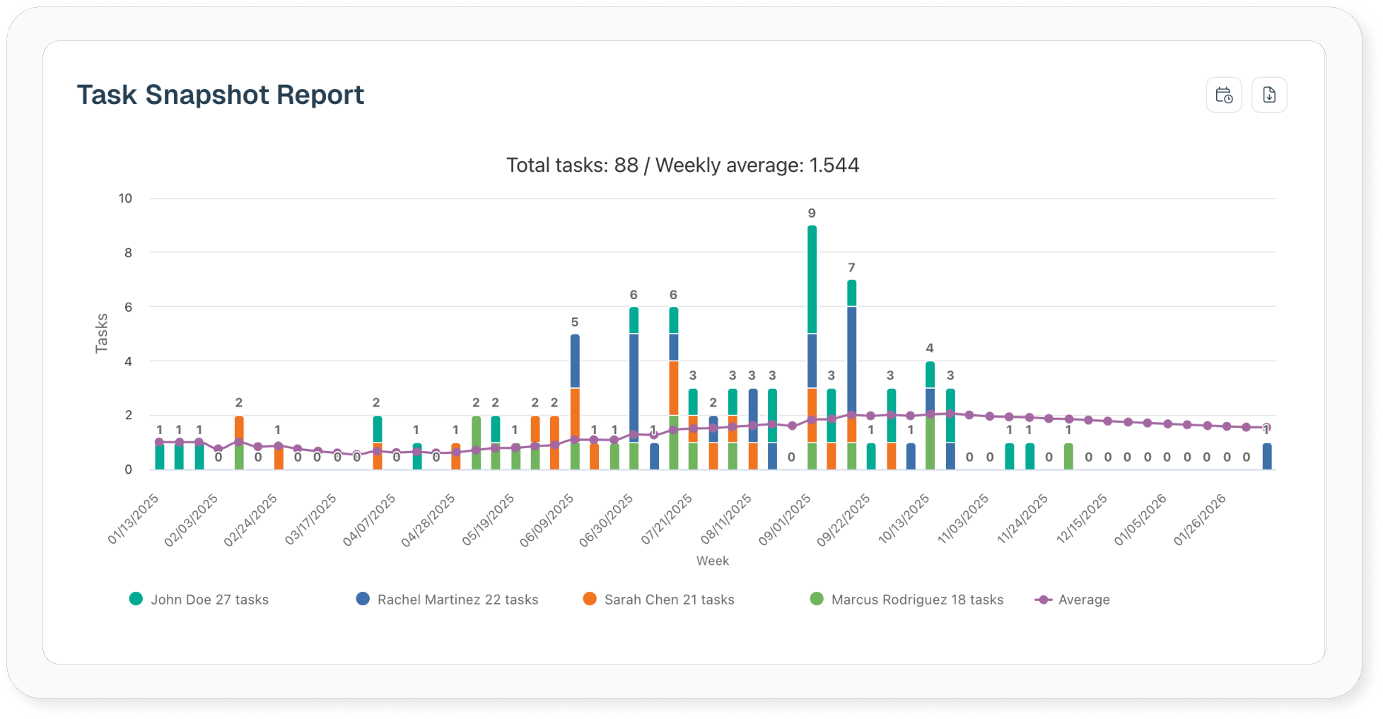 The Task Snapshot Report graphs tasks over time by task status. If you need to calculate a project’s tasks workload this might be a good fit.