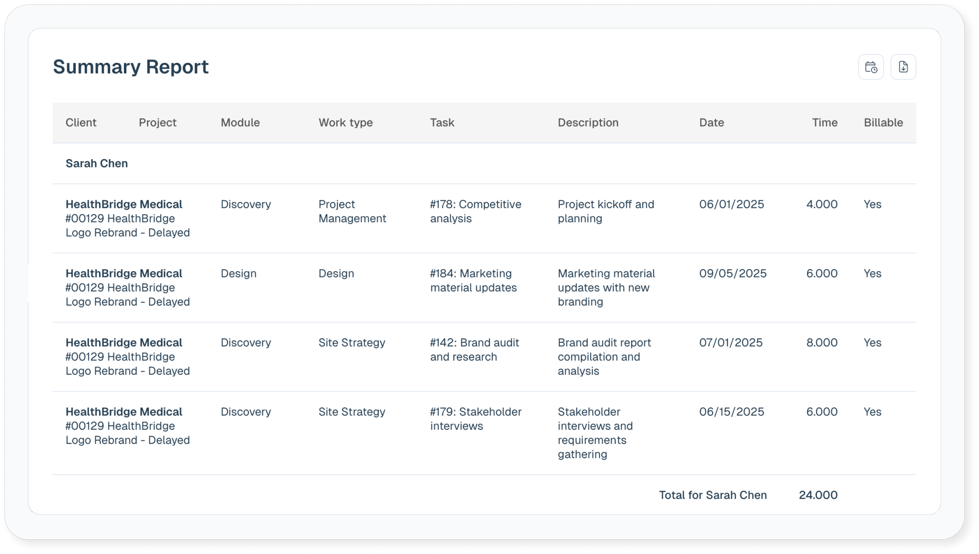 Do a Summary Report for deeper insight into your clients, your projects, and team productivity. There are many report combinations to look at here.