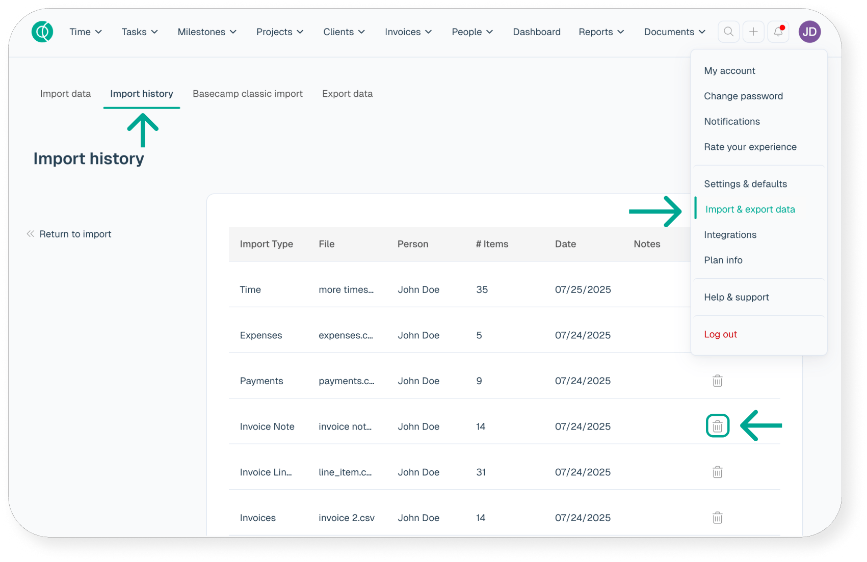If you import data and decide that you do not want to use the imported data it can be deleted. Navigate to Profile Dropdown >> Import & Export Data >> Import History. From the import history page click on the trashcan icon to delete the desired import.