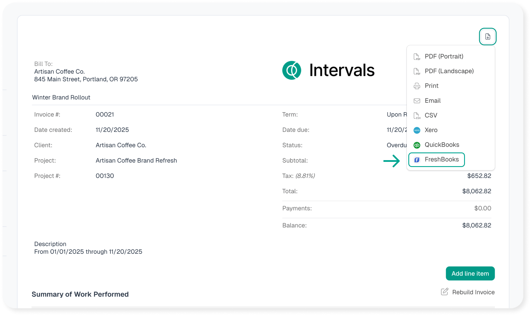 FreshBooks is cloud accounting software designed for small businesses and freelancers. With Intervals you can copy your Invoices directly to your FreshBooks account. Please note if you have a FreshBooks Classic account it is not supported at this time. Only the new version of FreshBooks is supported.