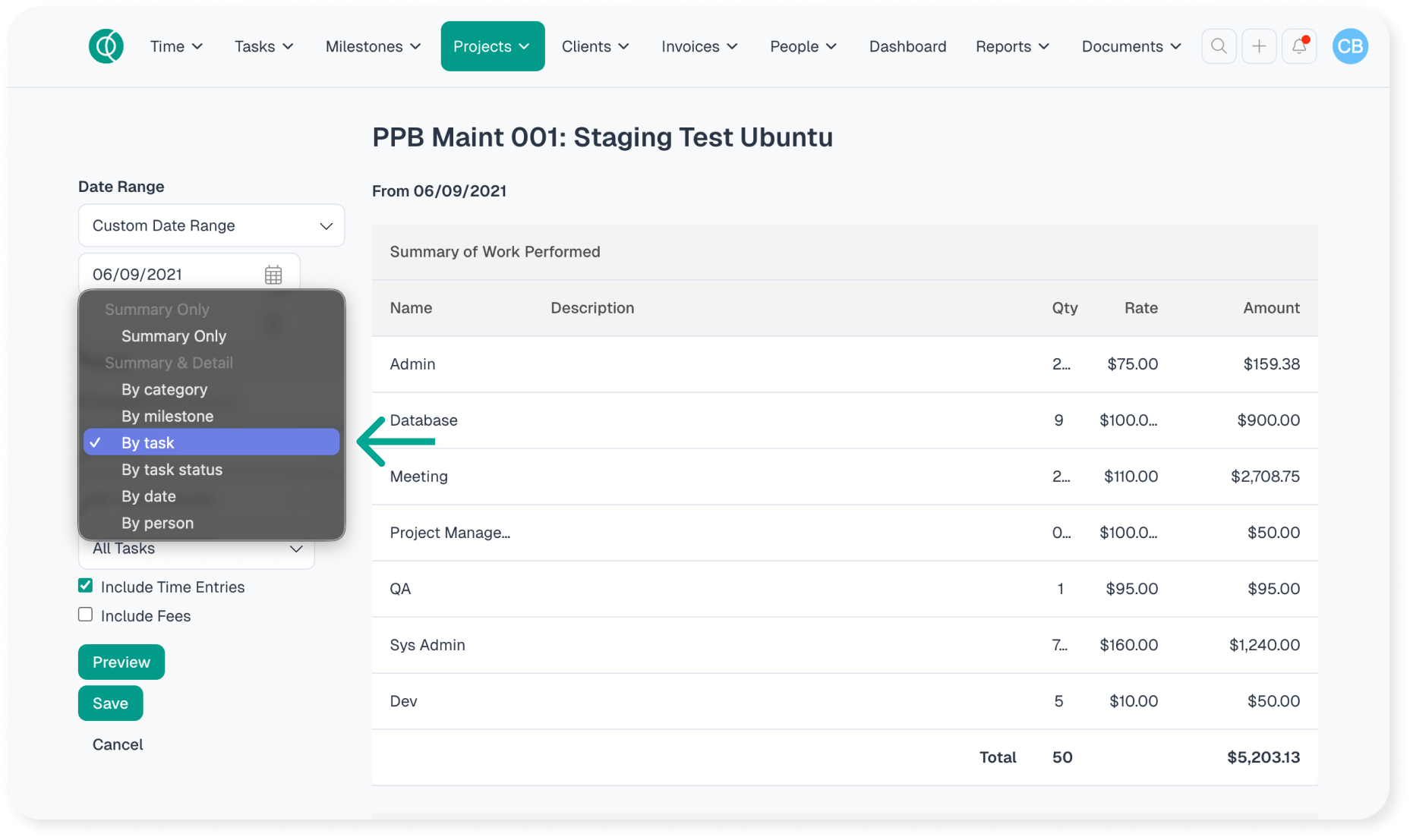 When building invoices with this option you can choose a Summary or Summary & Detail mode: