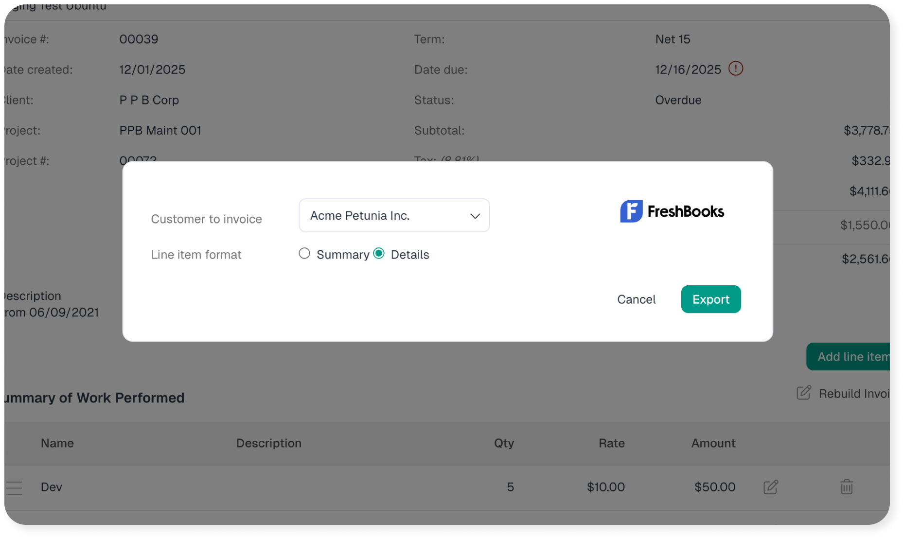 The summary of line items is exported while preserving any Term & Tax Defaults you setup from the Default invoicing section. Please see the invoice before and after below. Notice how the Details section is exported to FreshBooks: