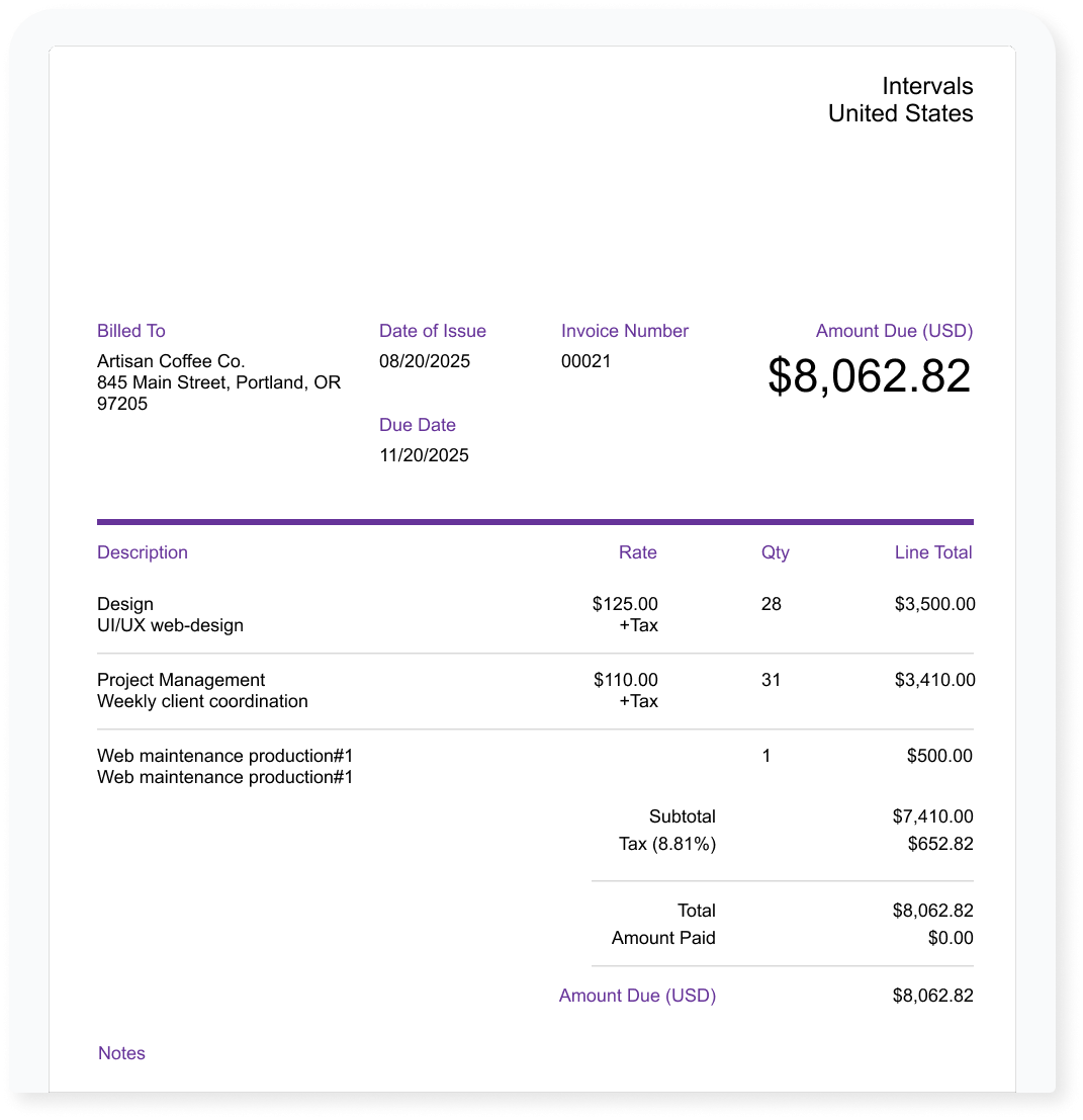 - Copied to the notes field. Intervals lets the FreshBooks system decide the next invoice number.