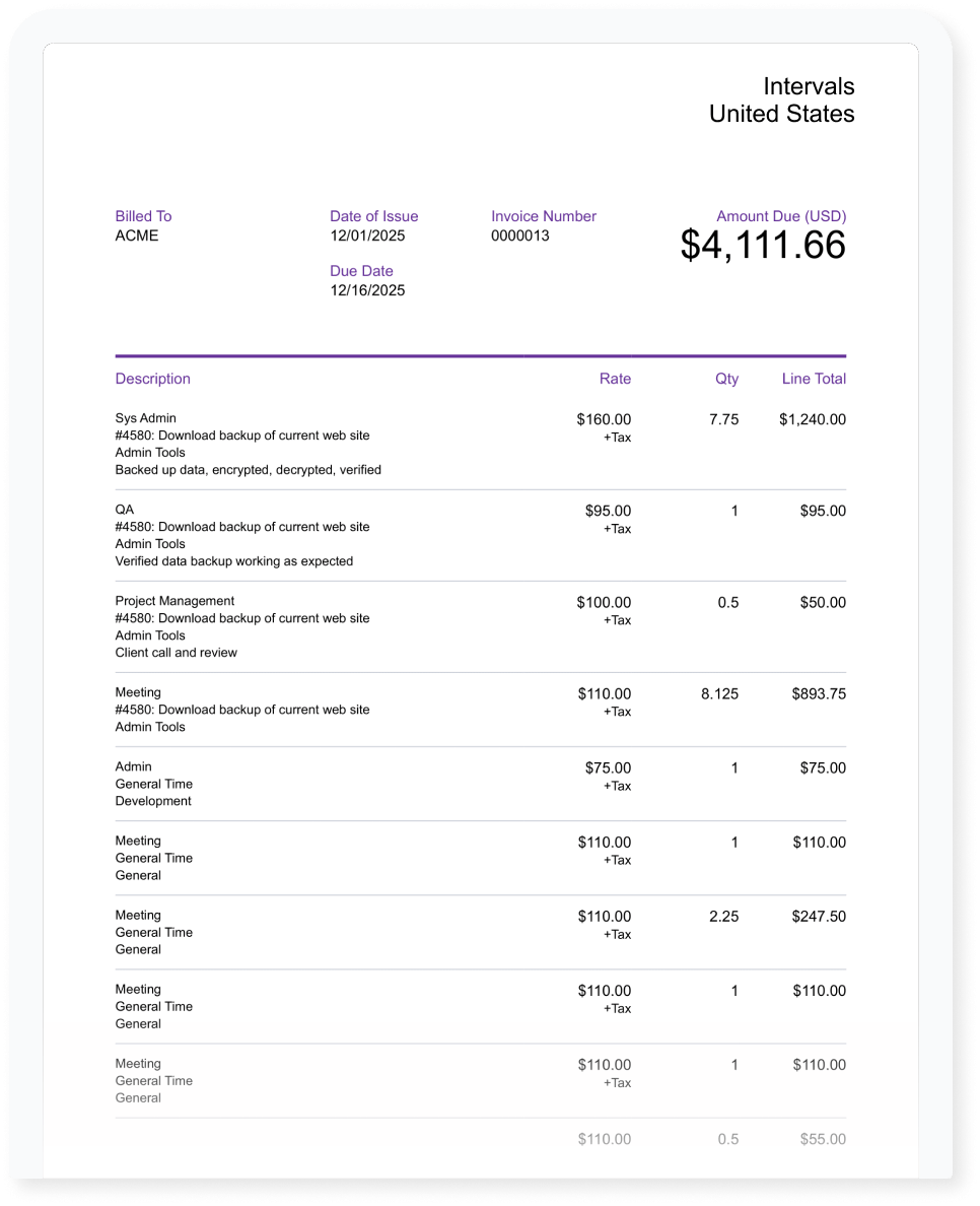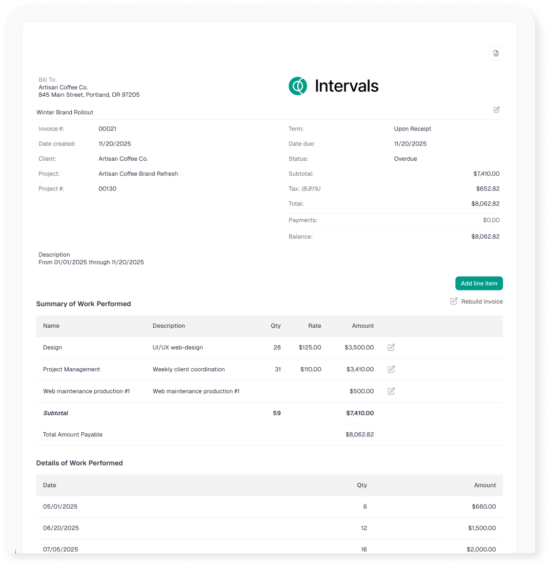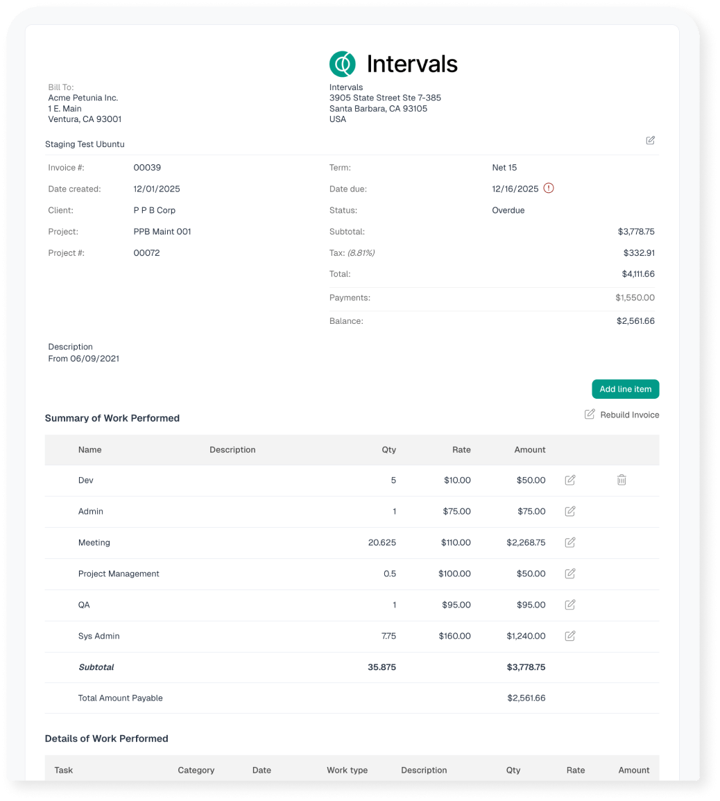 - Available for invoices built from work performed (with time entries) and the detail line item format. Free form invoices do not send this value.