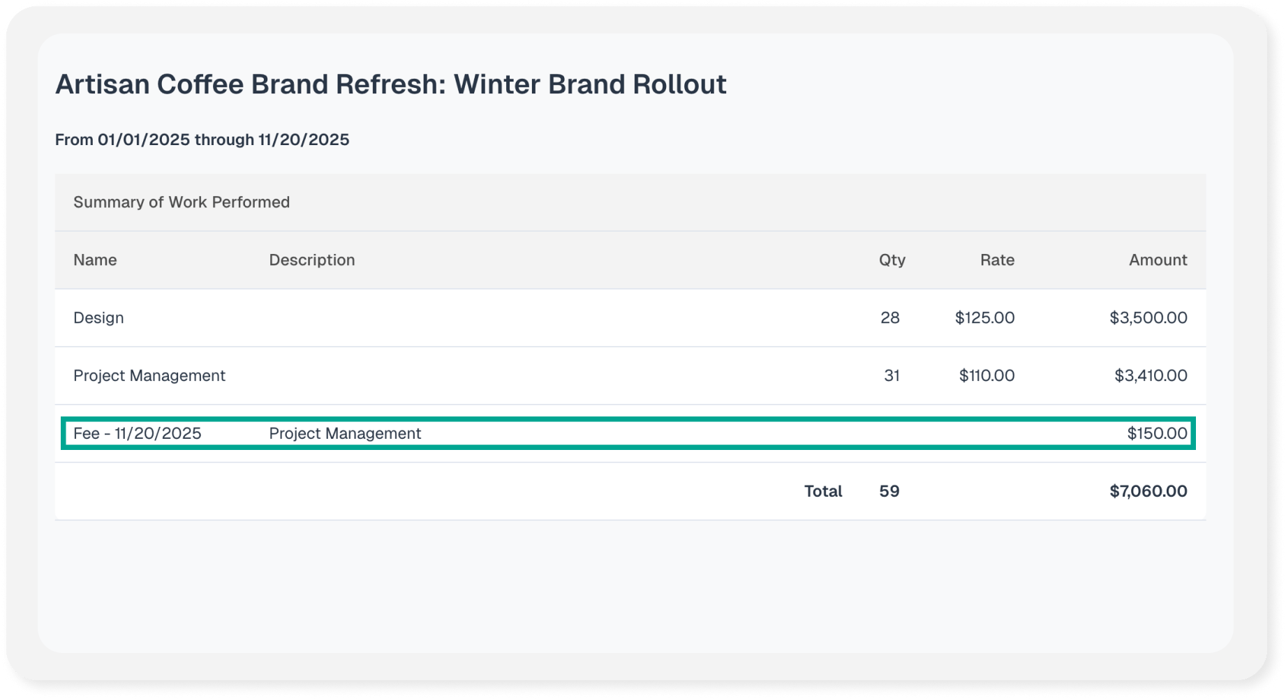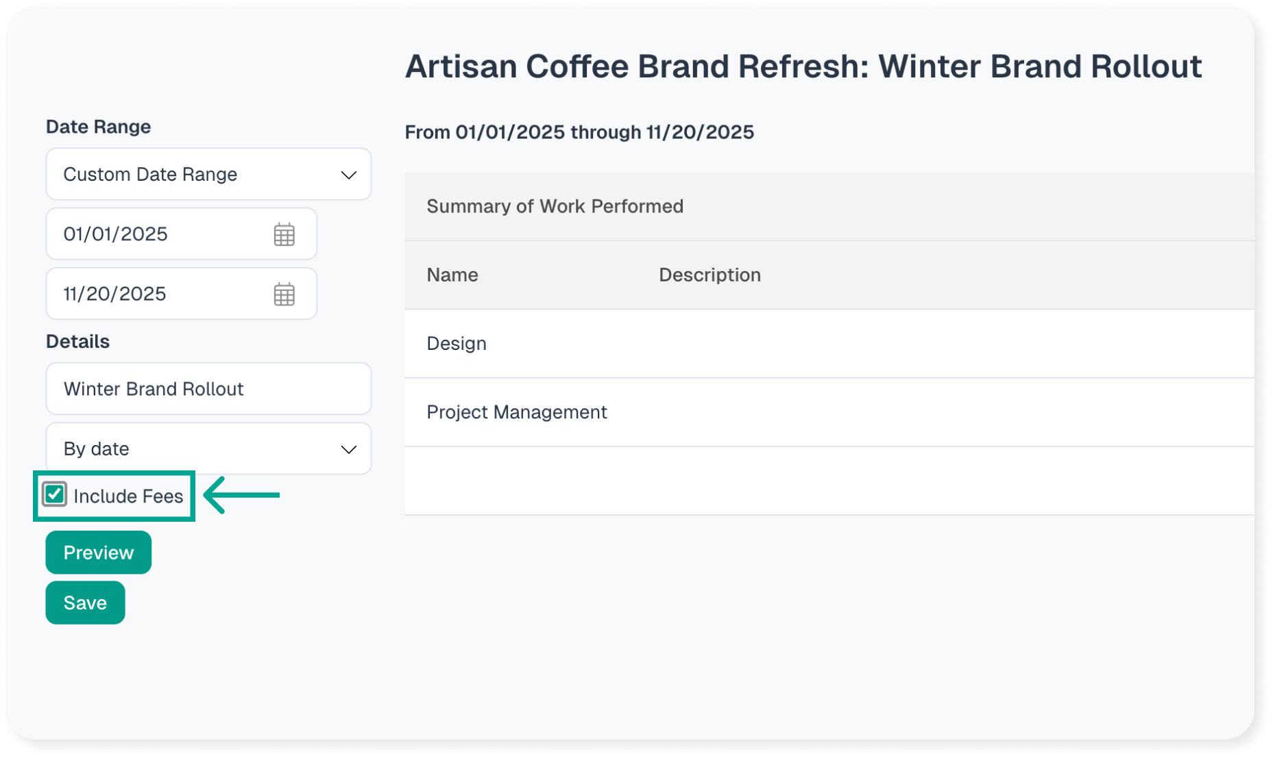 Another option is including any fees that were added to the project for the date rate that the invoice covers. If you are using fees/expenses with your projects, on step two of the invoice generation process there is an option to include fees. The fee is what is passed onto a client and can include a markup.