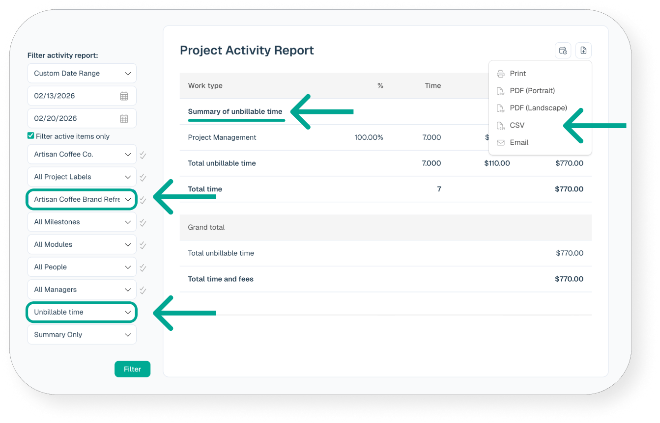 To generate a Project Activity report choose the same project and date range as your invoice, then select the unbillable time option in the left column. If you’d like to group the results by task, select that option as well. Then run the report and save as a PDF.