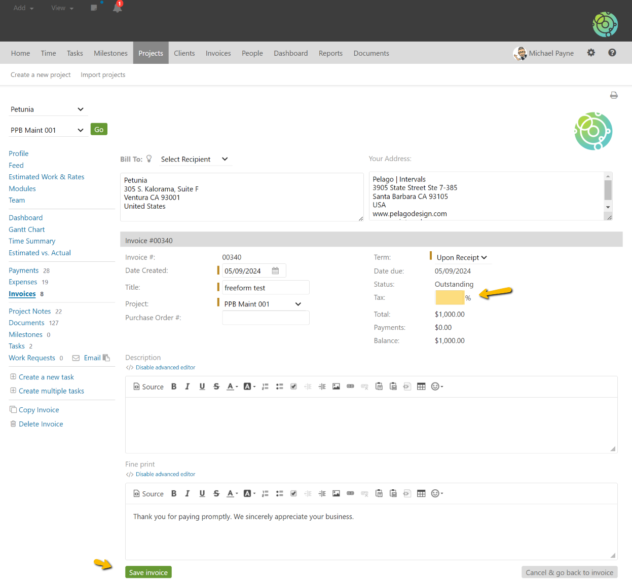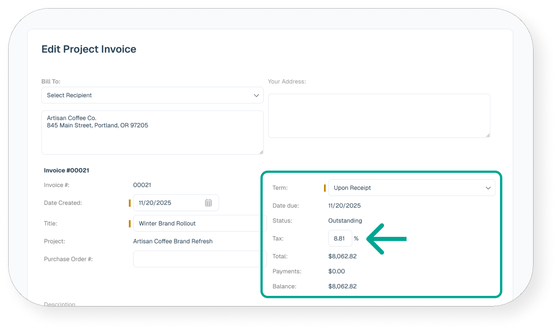 In edit mode on an Intervals invoice, you can apply a sales tax percentage directly to the invoice total, simplifying tax calculations without adding extra line items.
