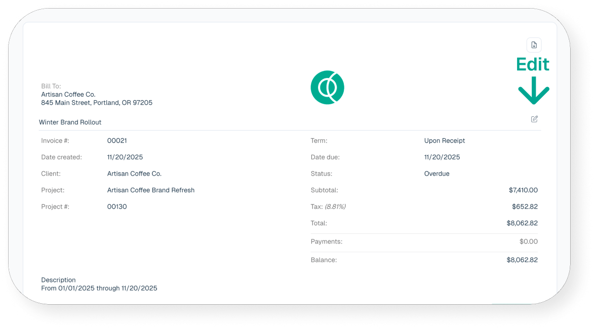 To add sales tax directly to an invoice in Intervals, select “edit” at the top of the invoice, which allows you to modify the top half of the invoice. This feature eliminates the need to add tax as a separate line item.