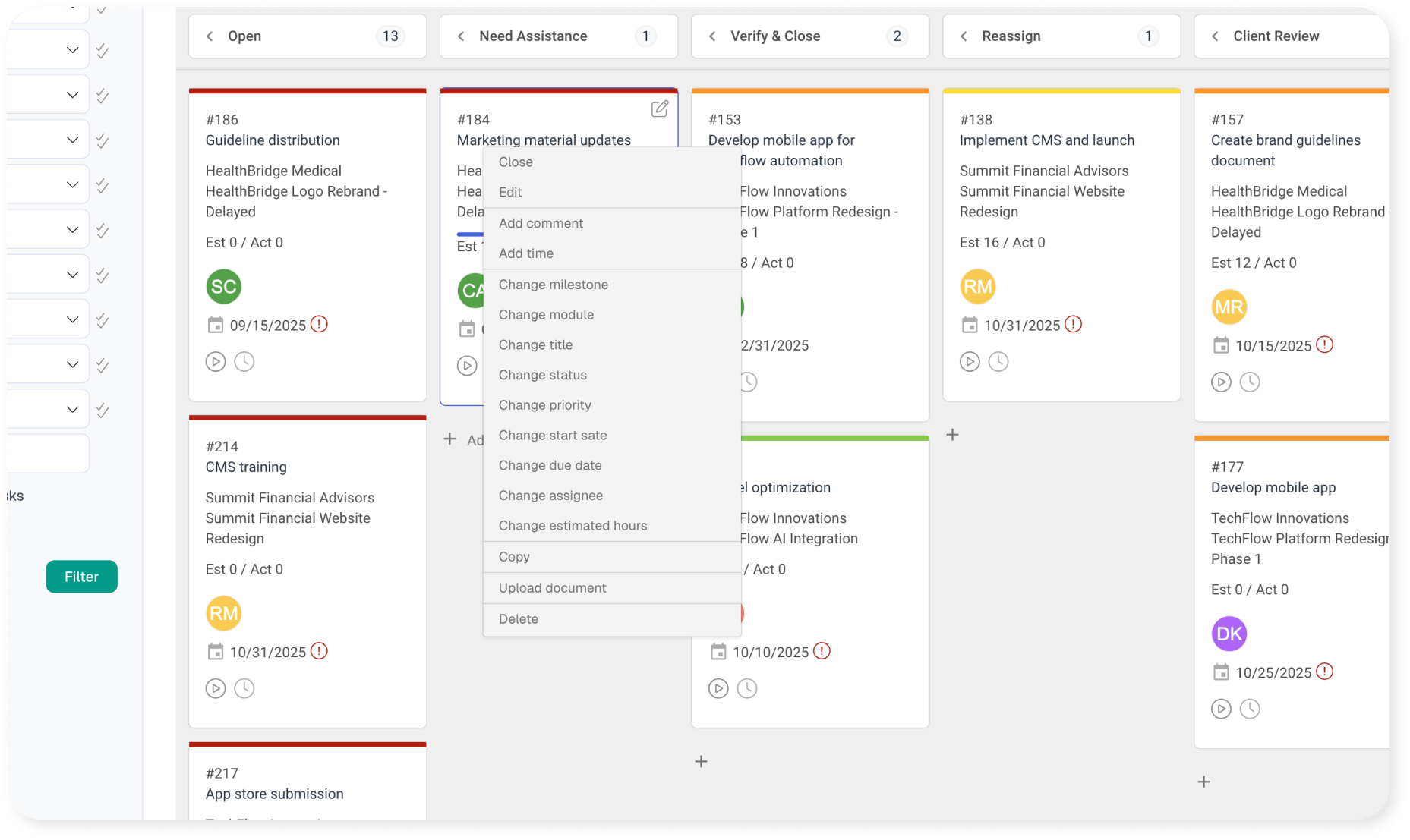 Tasks can also be updated in card view, just as they are in other views, by right-clicking on them. The right-click option can also be used for adding comments, time, and documents to a task.