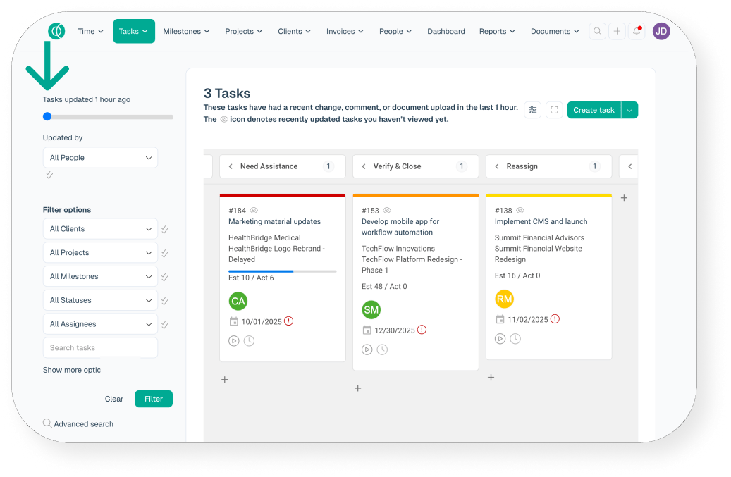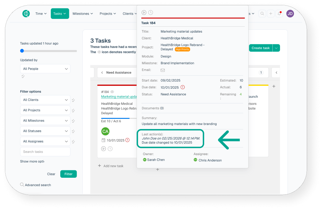 When viewing the task list there is a “Recent” option in the menu. Clicking this will launch the recently updated tasks view. In this view you can run a filter to further narrow down the tasks or drag the slider to change the duration between 1 hour and 7 days.