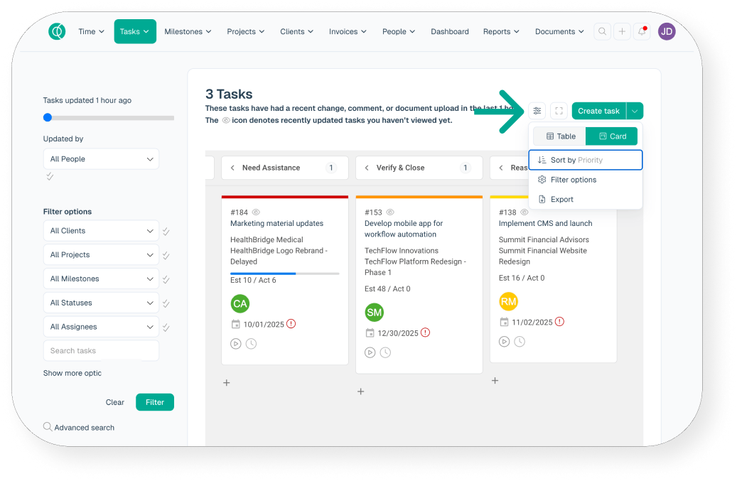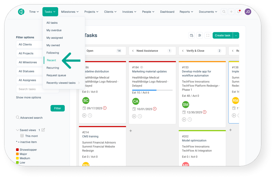 The recently updated functionality that exists in the tasks menu can be used in conjunction with card view to view recently updated tasks while using the kanban board.