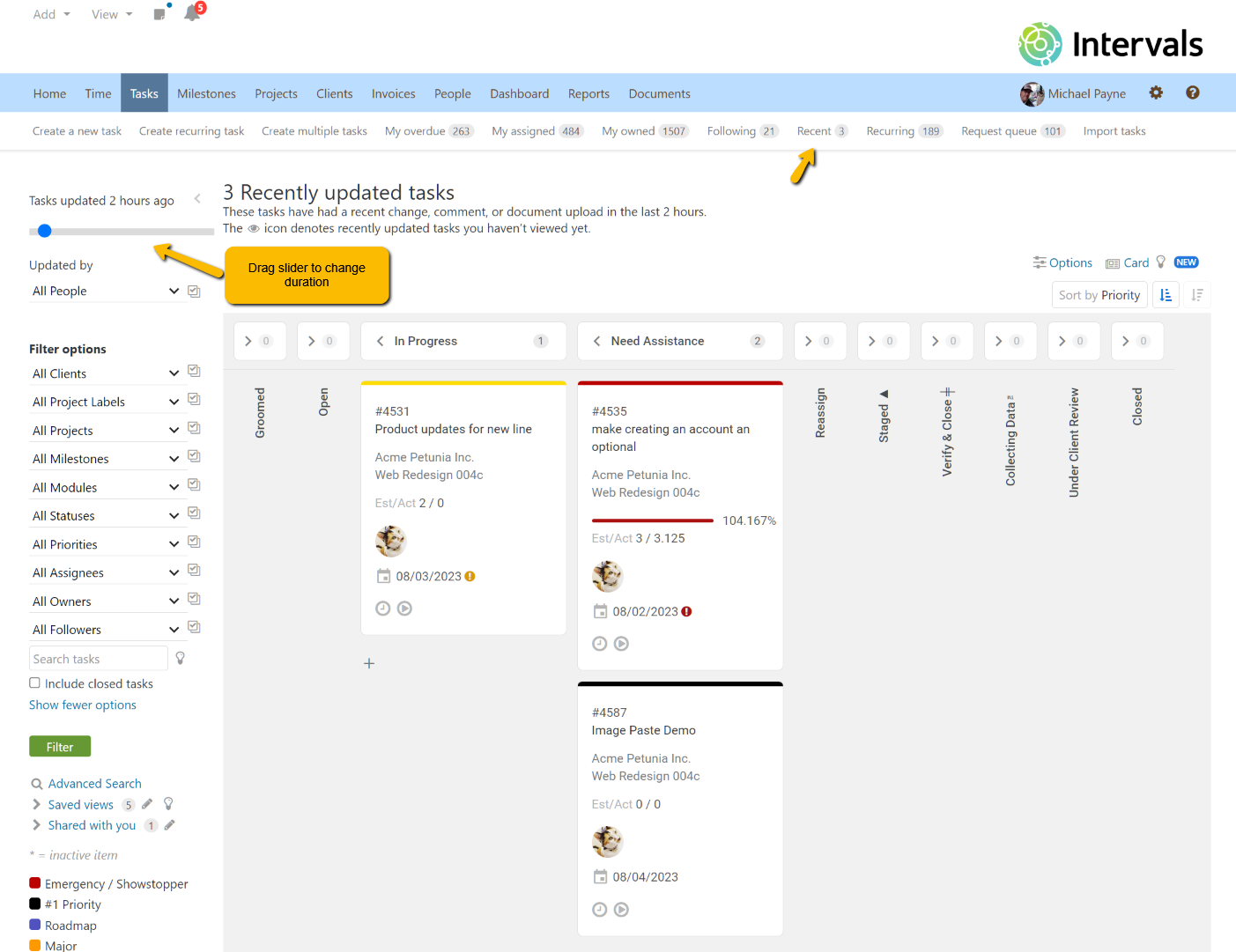 When viewing the task list there is a “Recent” option in the menu. Clicking this will launch the recently updated tasks view. In this view you can run a filter to further narrow down the tasks or drag the slider to change the duration between 1 hour and 7 days.
