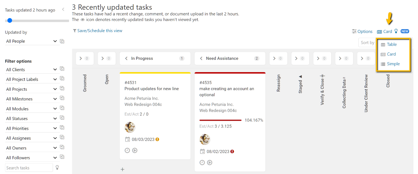The recently updated tasks view can be toggled like the regular task list. If while viewing it, you would prefer to see the table or simple view you can toggle between the views.
