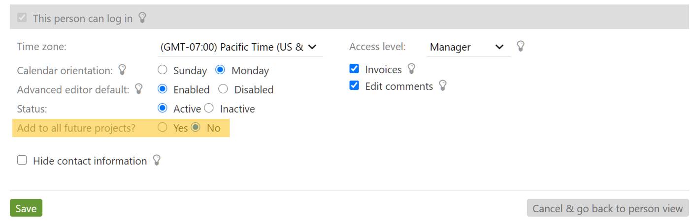 When enabled this person will automatically be added to each newly created project. You can still remove them from the new project if desired, but they will automatically be added to the project team when the project is created. This preference does not add them to projects that already exist.