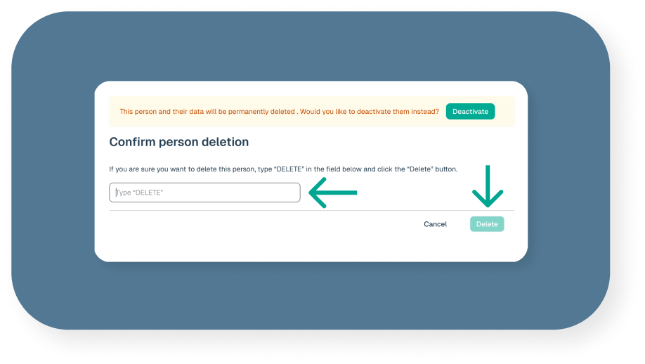 When deleting a person there is a confirmation step that will show which data is about to be deleted or moved: