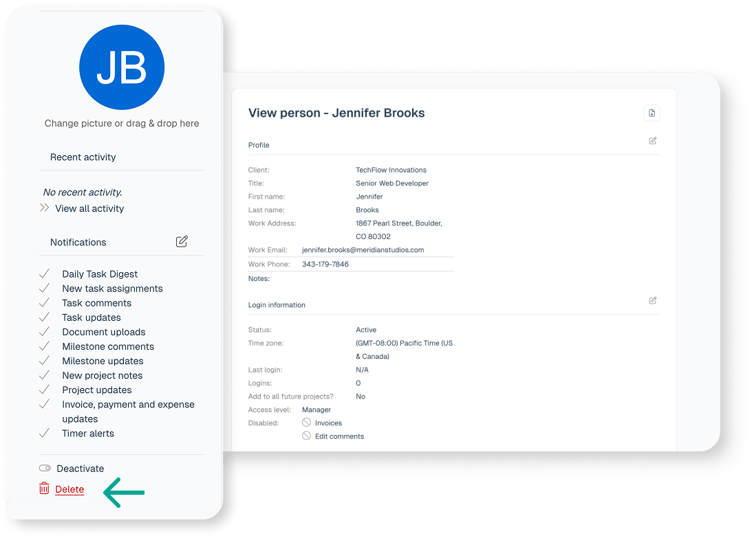 When a person is deleted their time data is deleted and their tasks, projects, and milestones are reassigned to the person performing the deletion. Since we do not charge per user it is always safest to set a person to inactive. If you have throwaway test data that you want to clean up and are comfortable removing the person and reassigning their data, here is how the process looks.