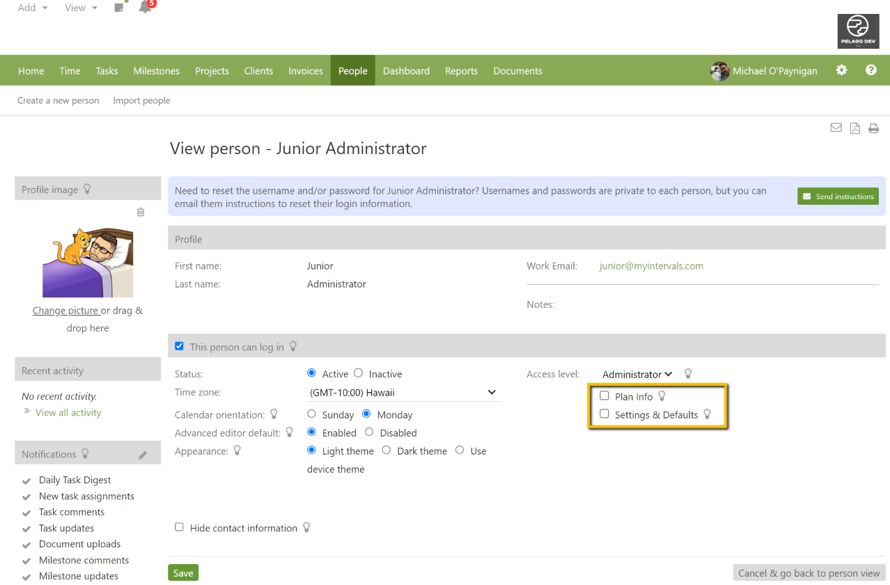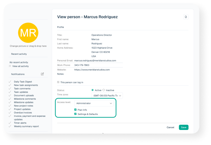 The Settings & Defaults preference controls whether or not the person can see and edit all of the defaults including default work types, default categories, task statuses, task priorities, default invoicing, the account name, the account subdomain, the account logo, the locale, and default time round up setting. Additionally, only administrator that have this setting enabled can export and import data.