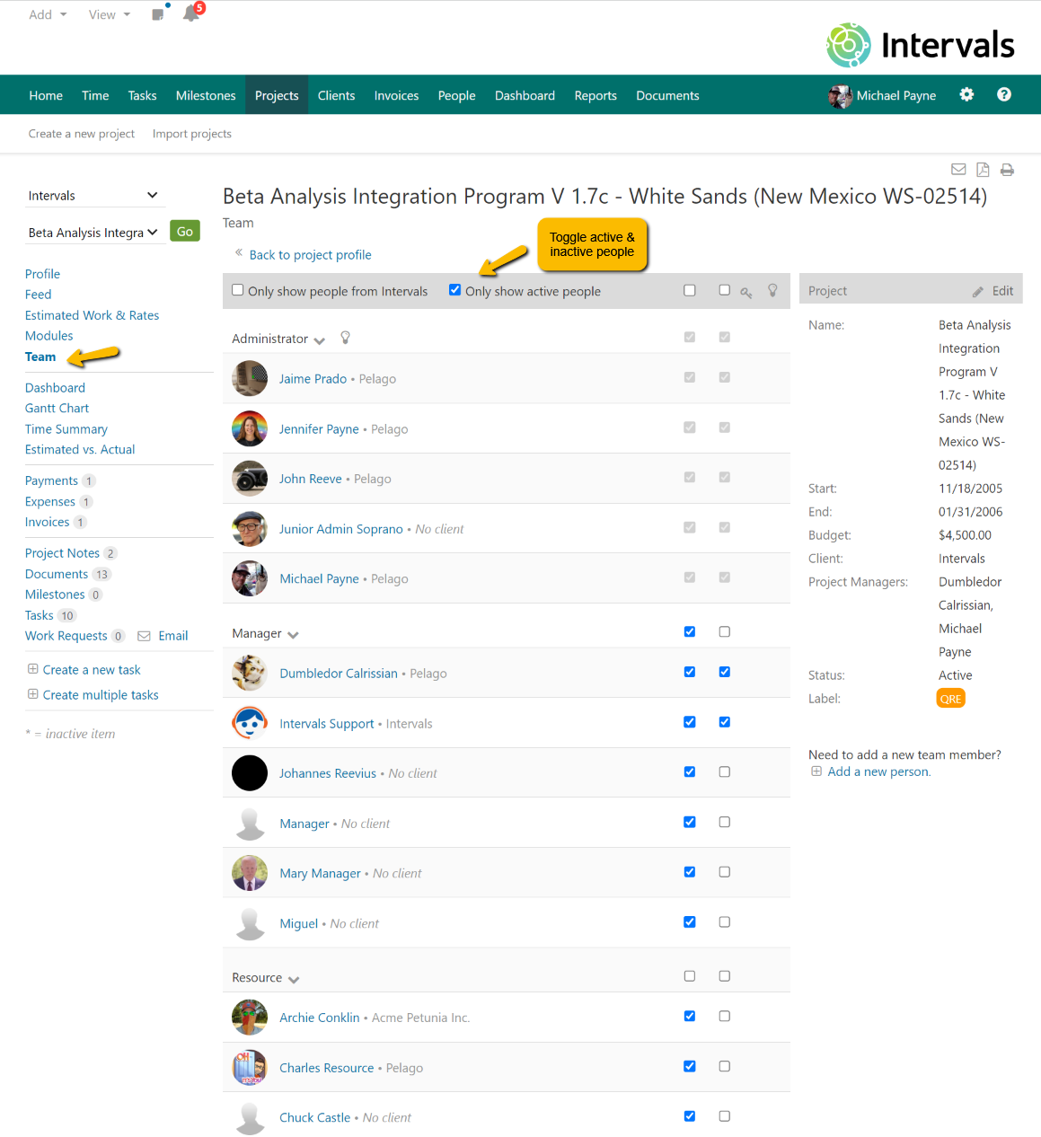 With this Intervals customer the issue was that the person they were trying to add to the project was inactive. You can add inactive people to a project, but inactive people cannot login and can’t work on any projects. This Intervals customer was trying to rework some of their legacy projects and team members, then activate them.