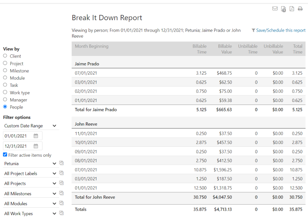 The Break It Down report provides a powerfully simple way to analyze time by day, week, or month over a given period. The data can also be segmented by person, which makes it ideal for measuring your team’s tracked time over sequential periods. For example, the report can show how many hours each person put in each month since January.