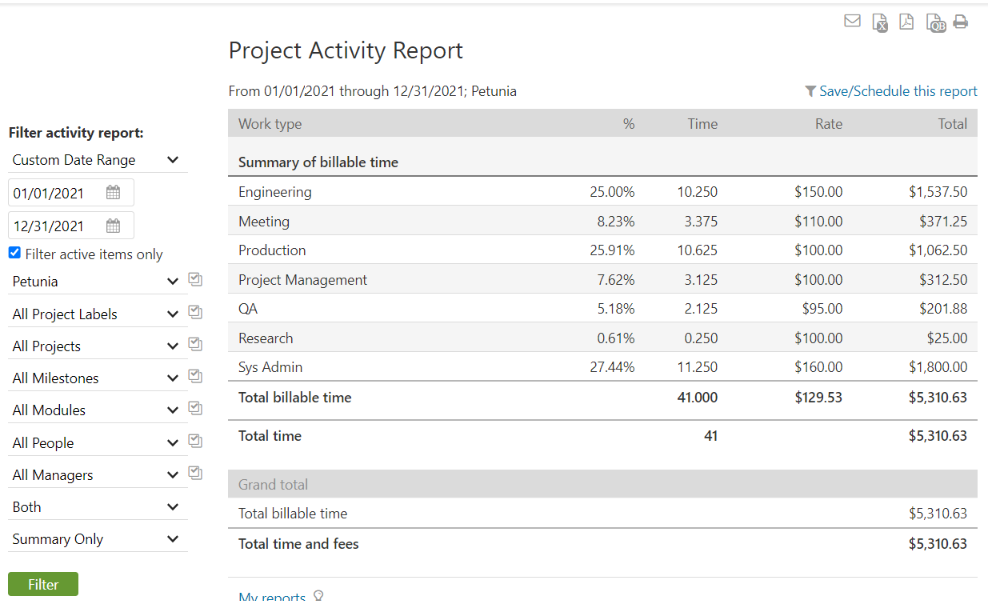 The default view of the project activity report is a summary of your time grouped by hourly rate. This makes it the ideal candidate for measuring profitability by work type. For example, the report can tell us how many hours were spent performing various responsibilities, such as managing the project, attending meetings, writing documentation, and so on.