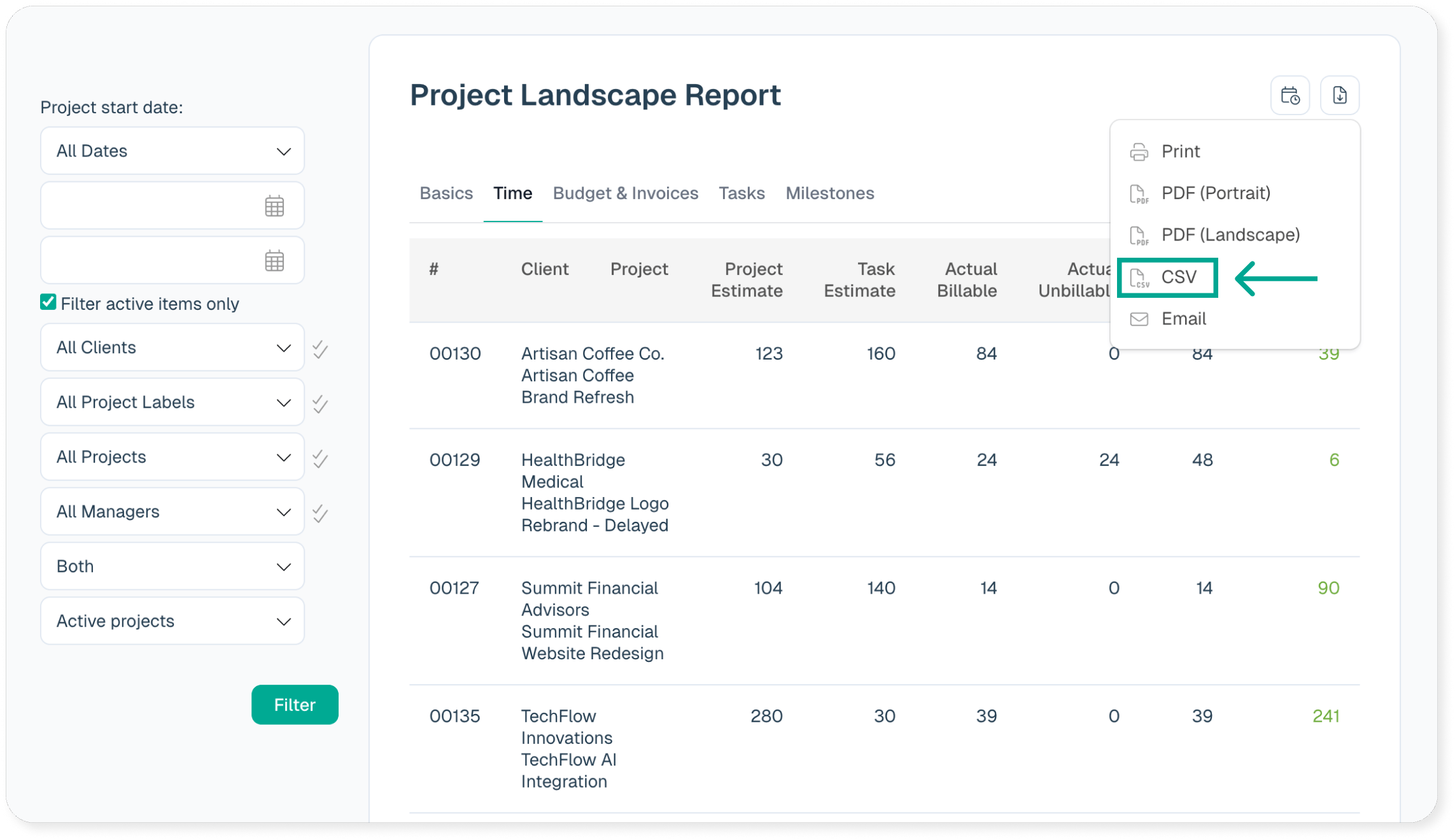 There are a few options on this front. One item is the project landscape report. After running the report there are tabs that show time totals, budget totals, etc. It is similar to the dashboard page but broken down a little bit differently. The project landscape report is probably the most comprehensive high level report.