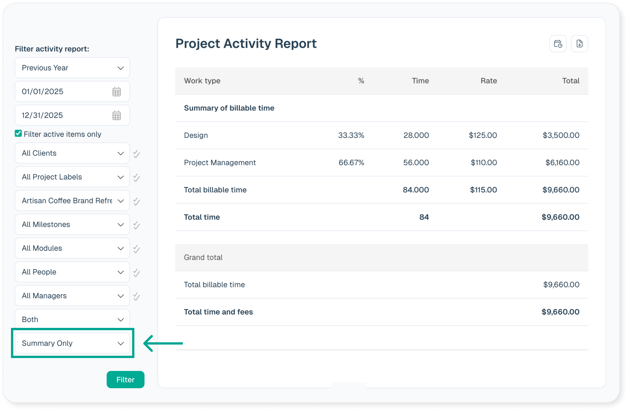 For seeing the actual amount of work done (and the financial value of work) for a date range, the project activity report is probably the best report. When running the report you can change the “summary only” drop down so that the work is subtotaled by the desired grouping (task, project, milestone, etc.). For example, you can group each project together to see the amount of work done by project.