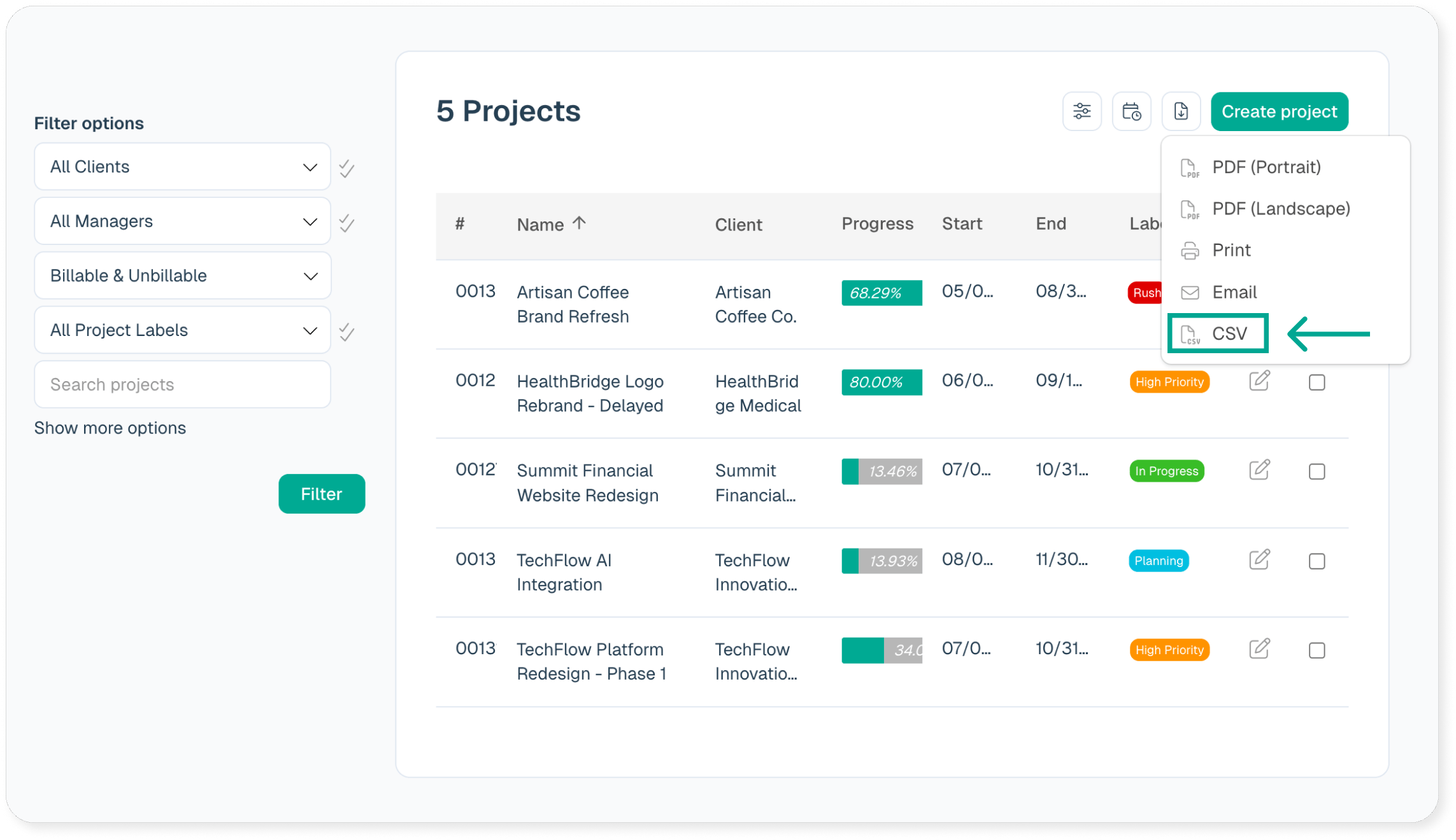 Another option is the project listing itself. If you click on the export to CSV option at the top of the listing, there is a healthy amount of information in the export.