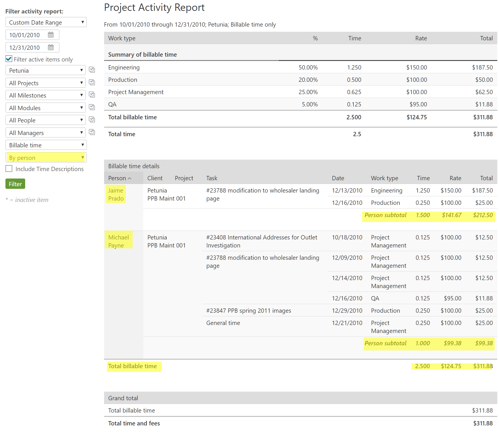 If “by person” is selected, each person that performed work during the date range of the report will show up on the bottom half of the report. This detail will include the amount of time, the task (if applicable), and the type of work for each time entry recorded. There is an option to “include time descriptions” in the report filter options. If that is selected the detailed notes that were recorded when time was applied will be recorded as well.
