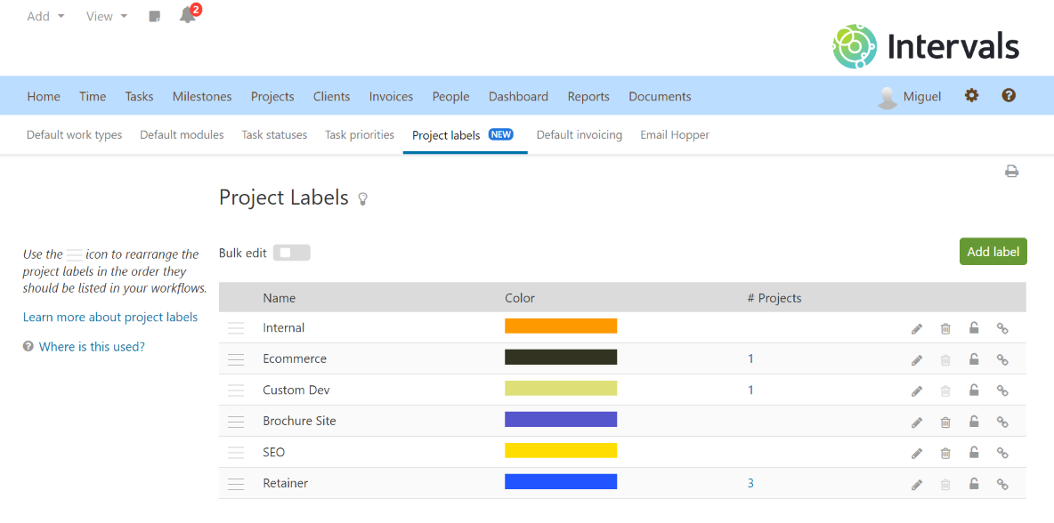 For example, this list can be used to track the steps, or phases, a project will go through as it’s being worked through to completion. When you create the list of project labels, drag and drop them into the right order for your workflow. Similar to task statuses, the labels will appear in the same order on project pages and reports.