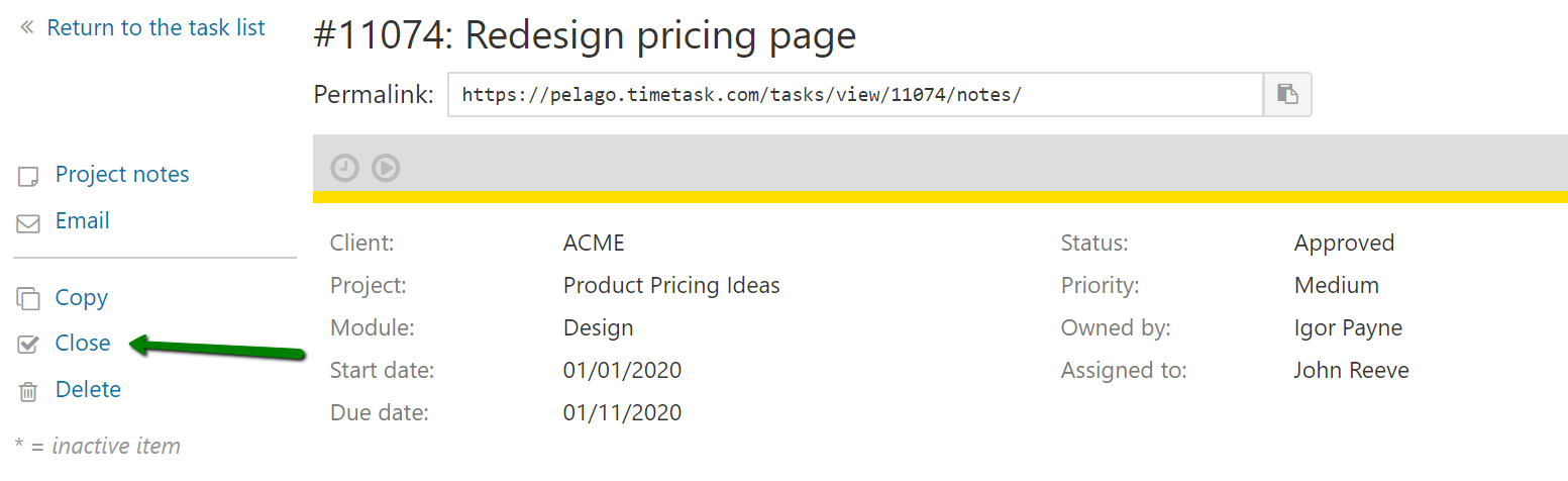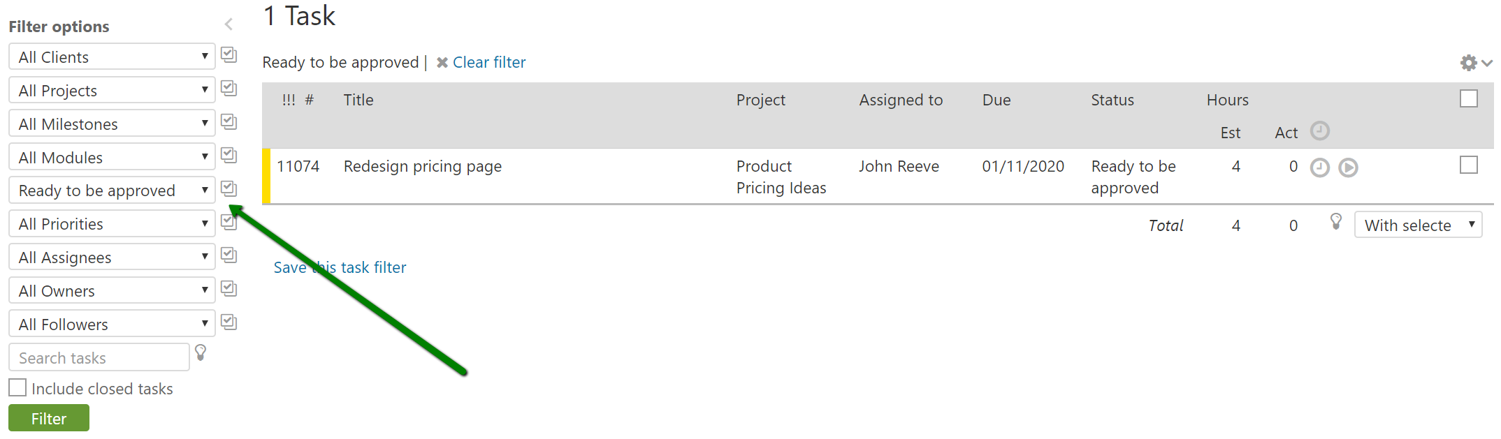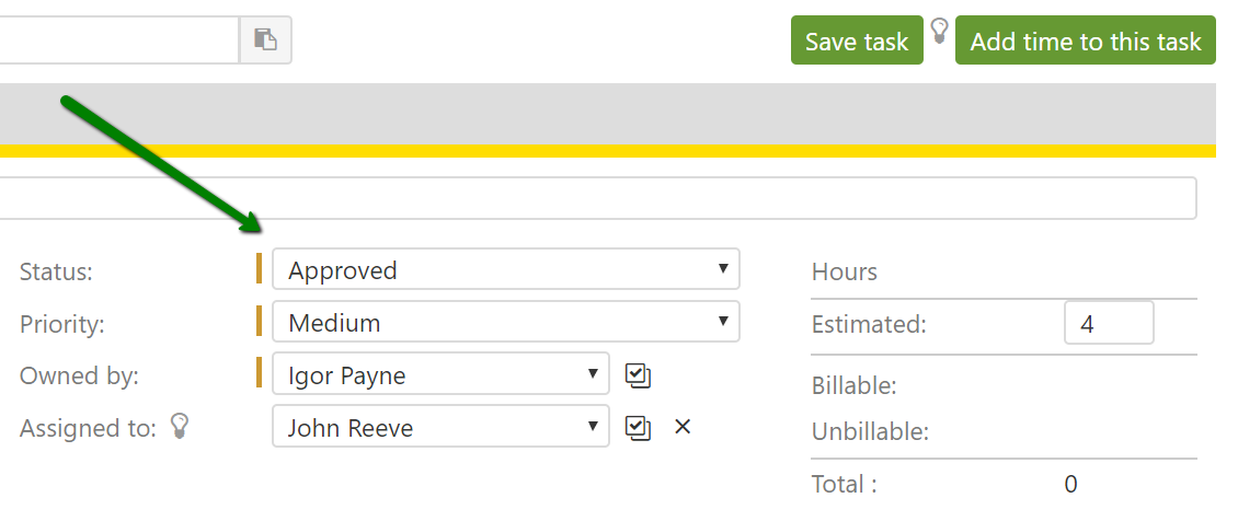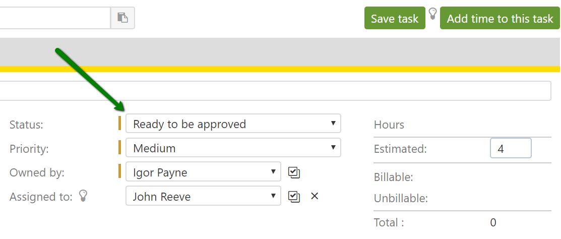 Using the example task statuses above, most tasks will be in the “In progress” state. When you are done working on a task and it’s ready to be approved, update the task and change the task status to “Ready to be approved.” This will result in an email notification being sent to the task owner, letting them know the task is ready for review. Another approach that some Intervals users utilize is to change task ownership at certain points in their worfklow. Depending on how you work that could be an option as well.