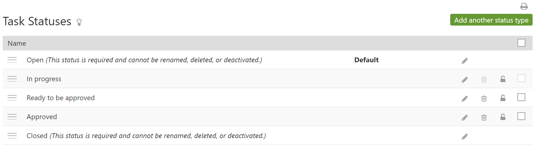 Task statuses are the steps that a task will traverse on its path from being opened to its eventually being closed. This list is meant to be customized to reflect your preferred task management workflow. For the purpose of approving tasks, we are going to add two task statuses — “Ready to be approved” and “Approved.”