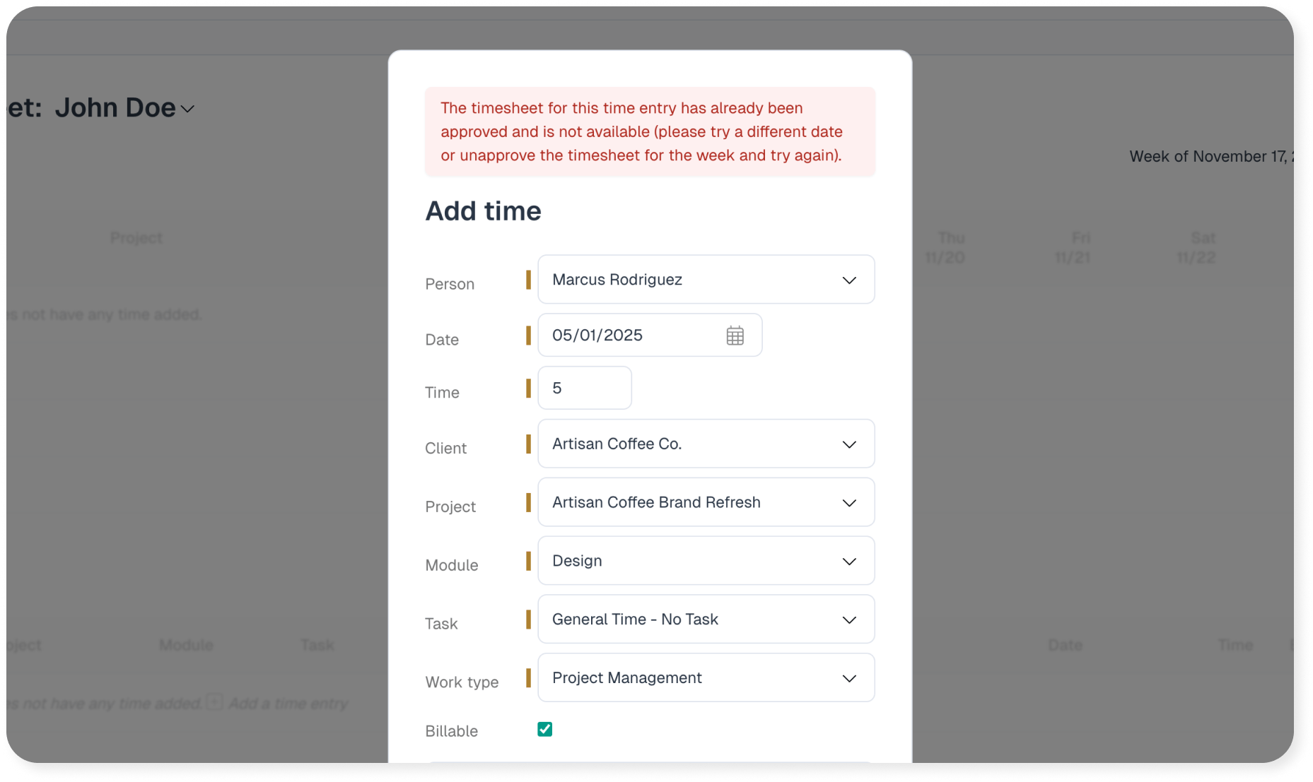 If you see this error message while adding time, it means that the timesheet for the given week has been approved.