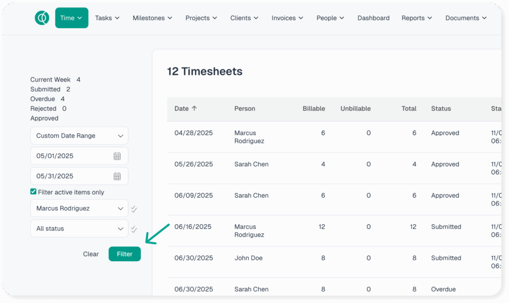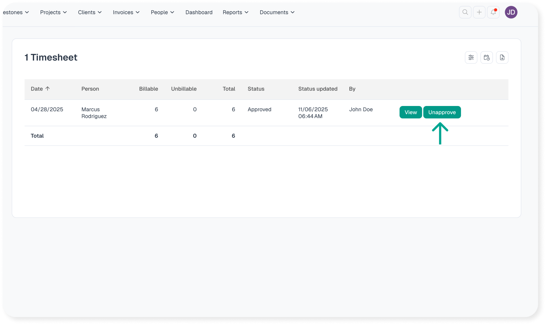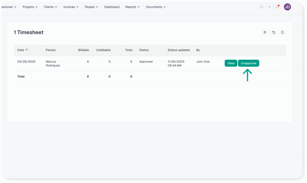 2. Run a filter to grab the desired timesheet(s) and click on the Unapprove button.