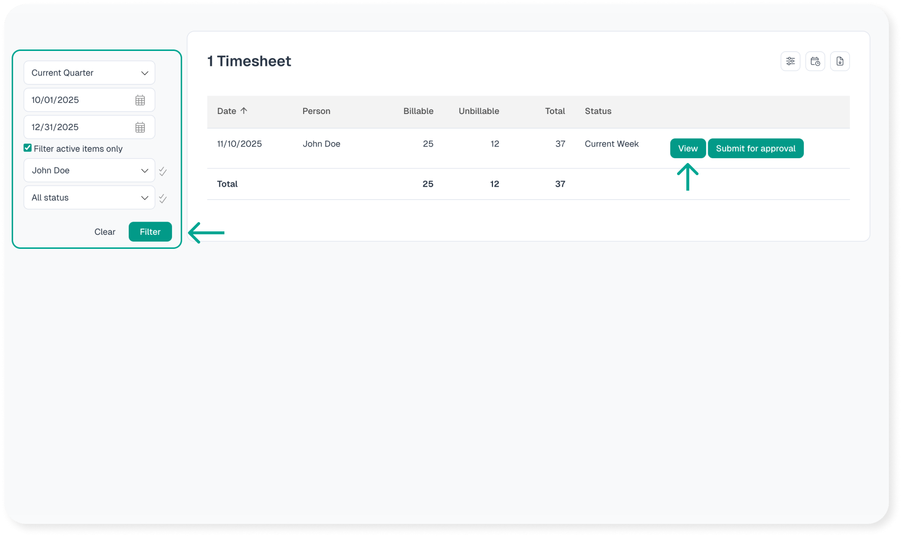The screenshots above show the functionality from a Manager level user. Resource level users have identical functionality. Administrators have additional functionality where they can copy time entries from one person to another person.