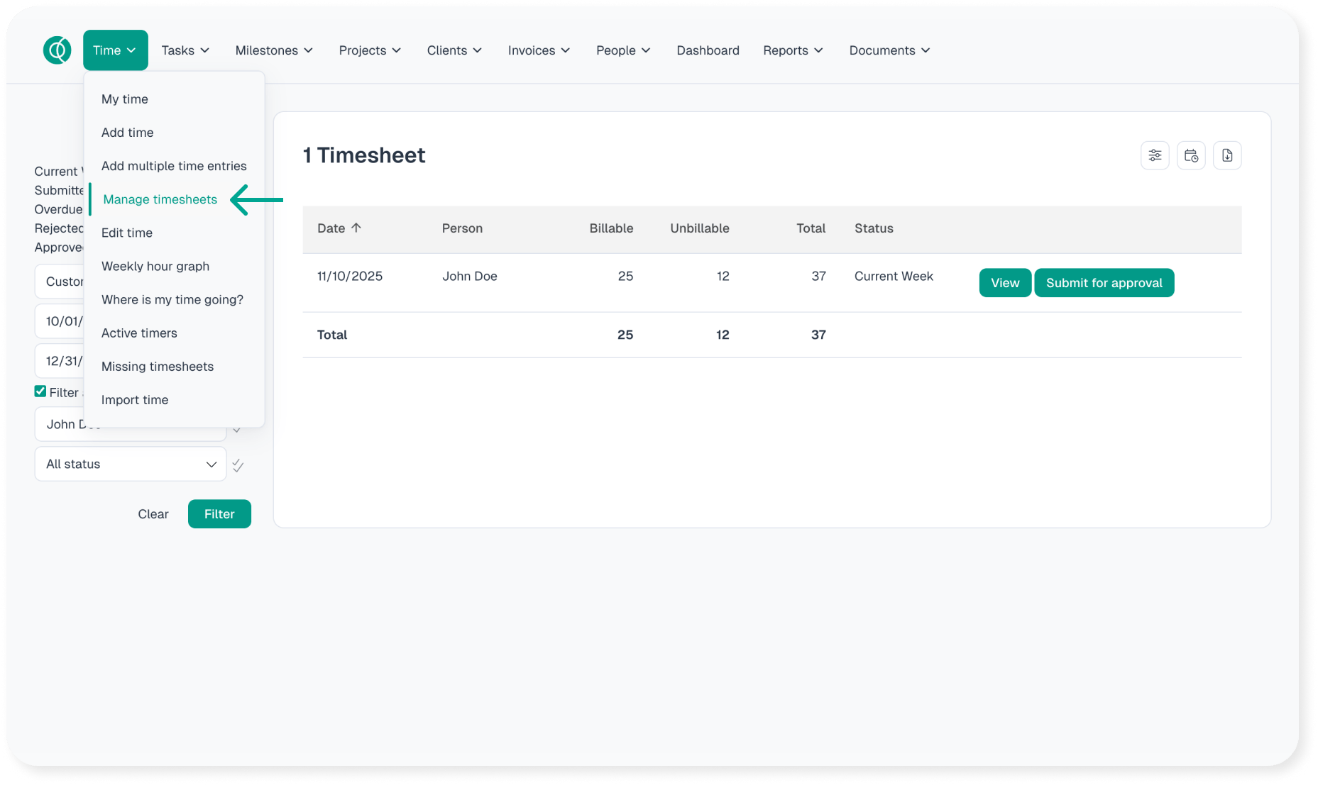 Navigate to Time >> Manage timesheets and run a filter to find the desired week. You can search by date and/or the status of the timesheet. Once you find the desired week click view to navigate into the timesheet.