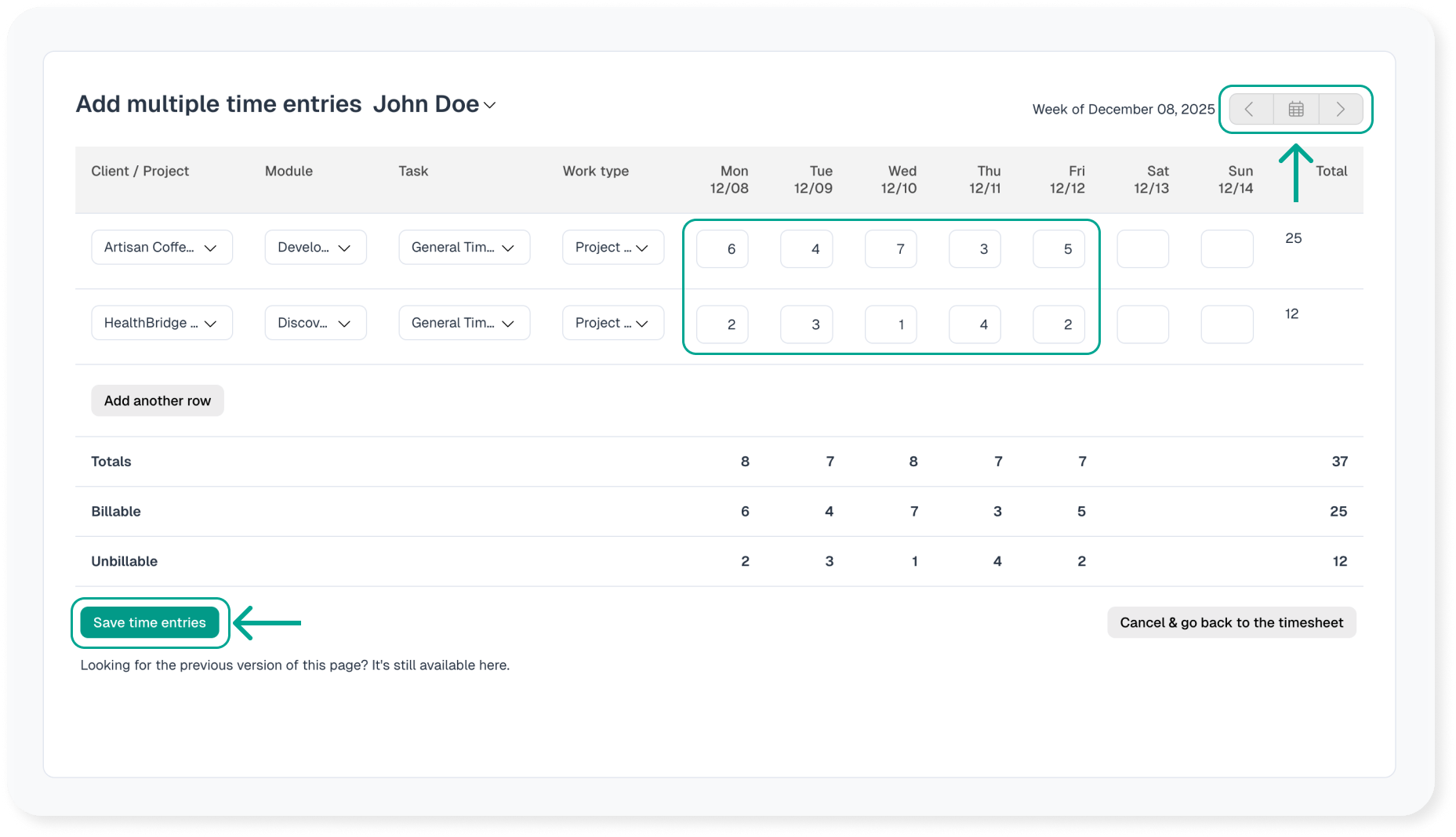 Save the time entries into the desired week to start with a pre-filled timesheet.
