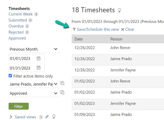 The functionality allows you to group timesheets together in a saved filter by status and team so that you can return to the timesheets with a single click. This can be helpful if a certain administrator on your time is responsible for approving the timesheets for certain team members while another administrator is responsible for approving the timesheets of different team members. The functionality is very similar to saving report and task list views/filters.