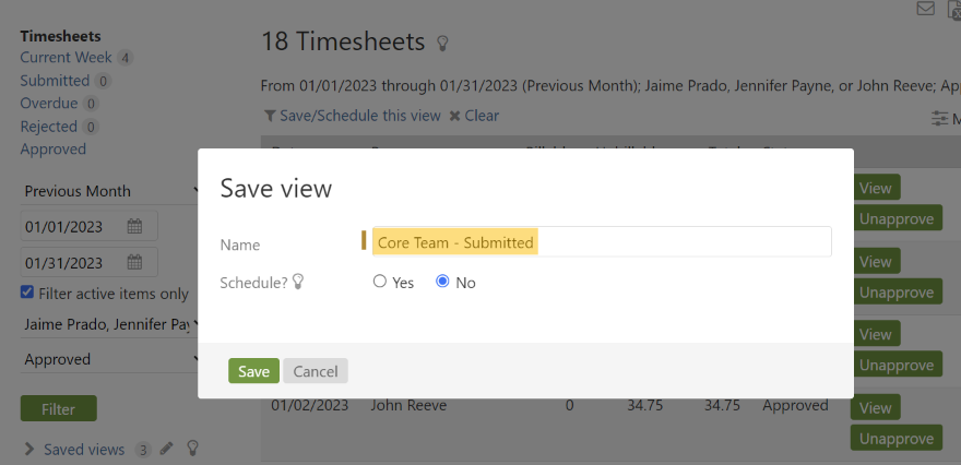 3. After running the filter to grab the desired timesheets, save and name the view/filter