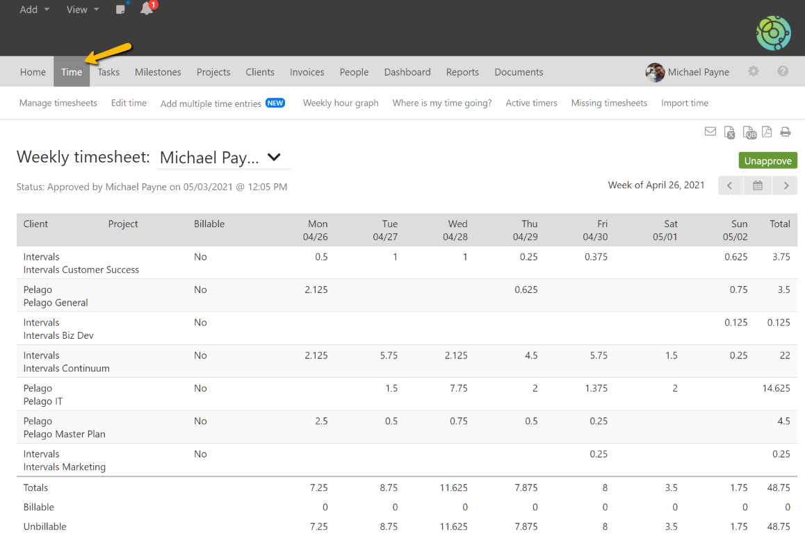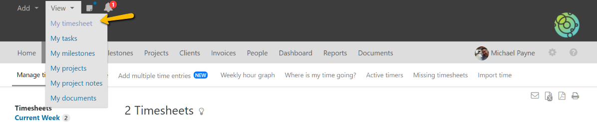 To submit your weekly timesheet for approval, first navigate to your timesheet. This can be done by using the “View” links in the header navigation and clicking on “My timesheet” or by clicking on “Time” in the primary navigation.