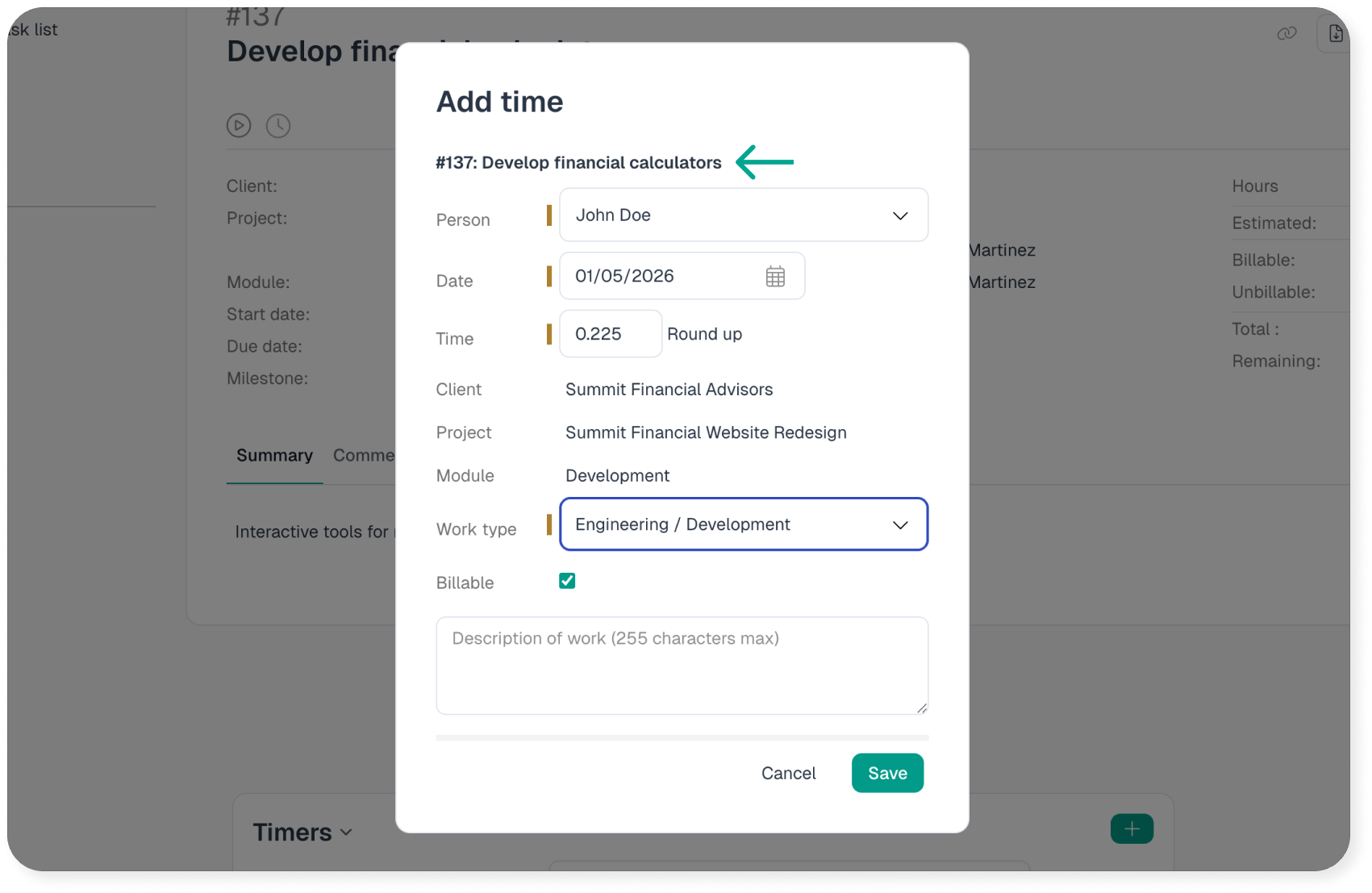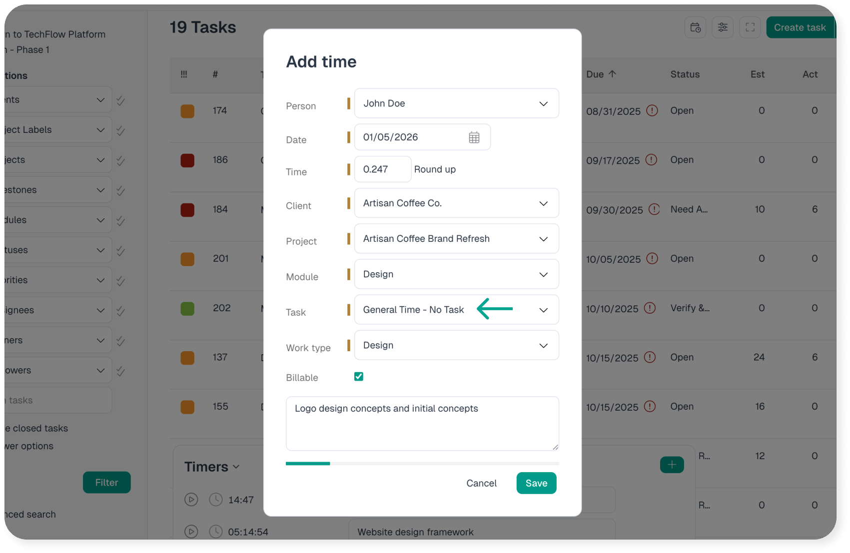 When applying (saving) a general timer, there is an option to apply the time to the project, without a task (General Time – No Task). For example: