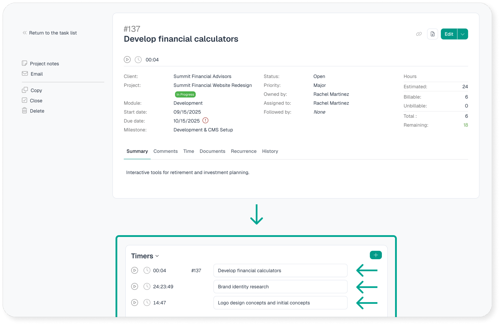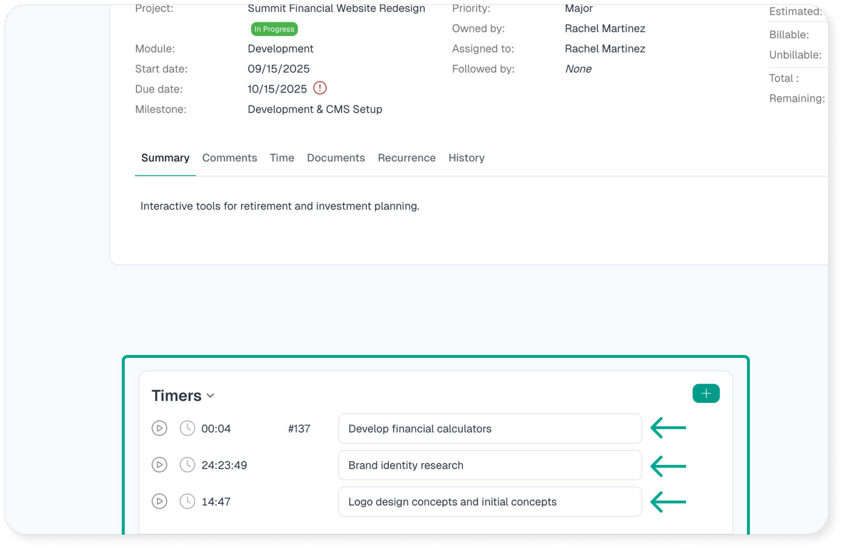 Timers are also easily accessible from your mobile device via the mobile app for convenience when you’re away from your desk and need to start, pause or apply a timer.