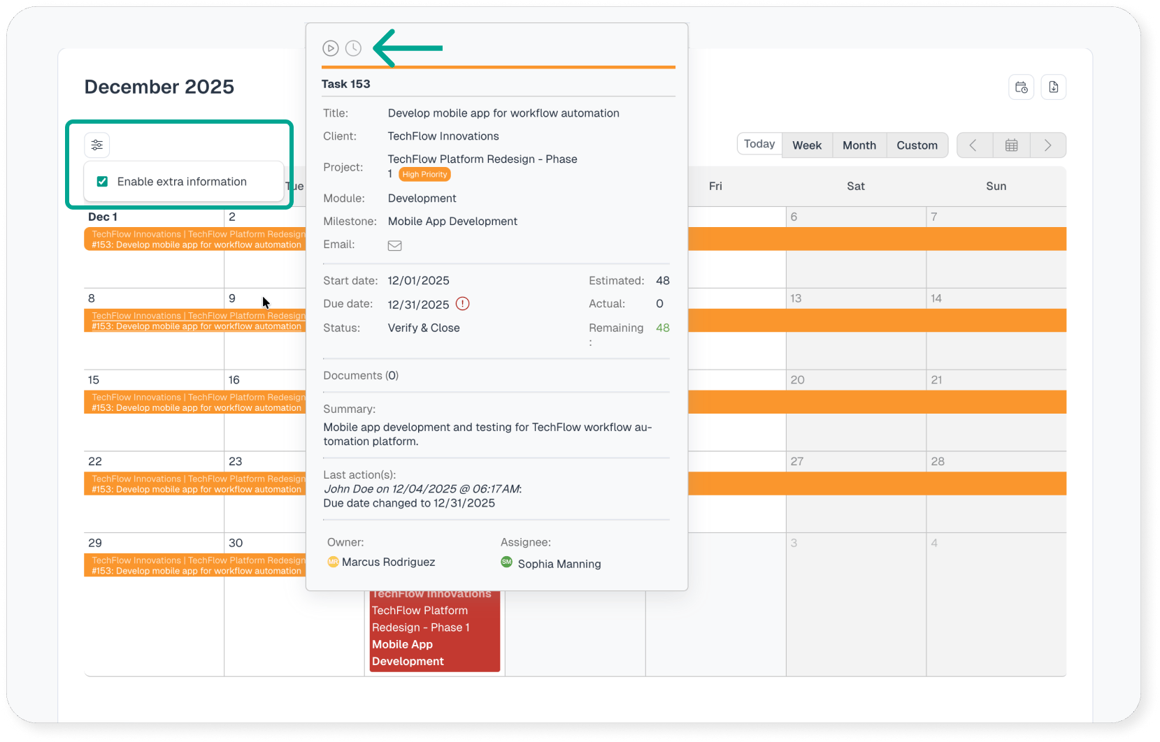 Timers can also be started by using the timer on the hover view for tasks. Hover pop-ups are available anywhere there is a link to a specific task and the Enable Extra Information checkbox is selected on the home page. Hovering over the task link will pop up information about that task, including the timer.