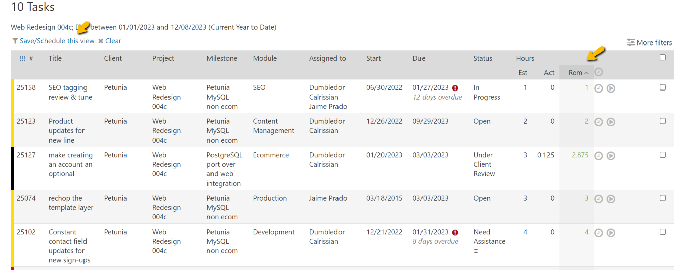 If you have a project or milestone that you are watching closely and want to keep a close eye on the remaining hours on the tasks a filter can be run to show those tasks. Once you have the desired task listing, click to sort on the “Rem” column to sort by remaining hours.